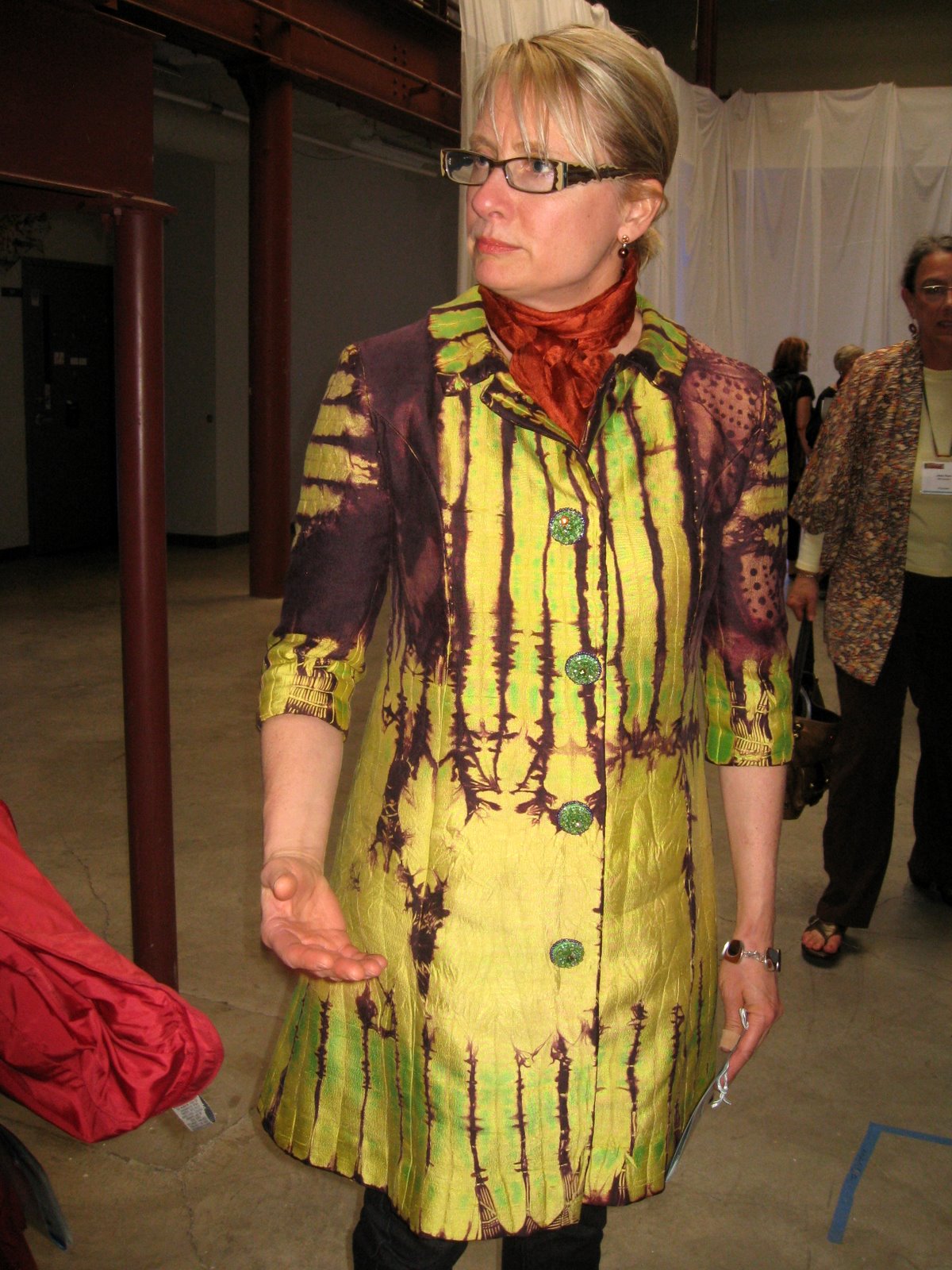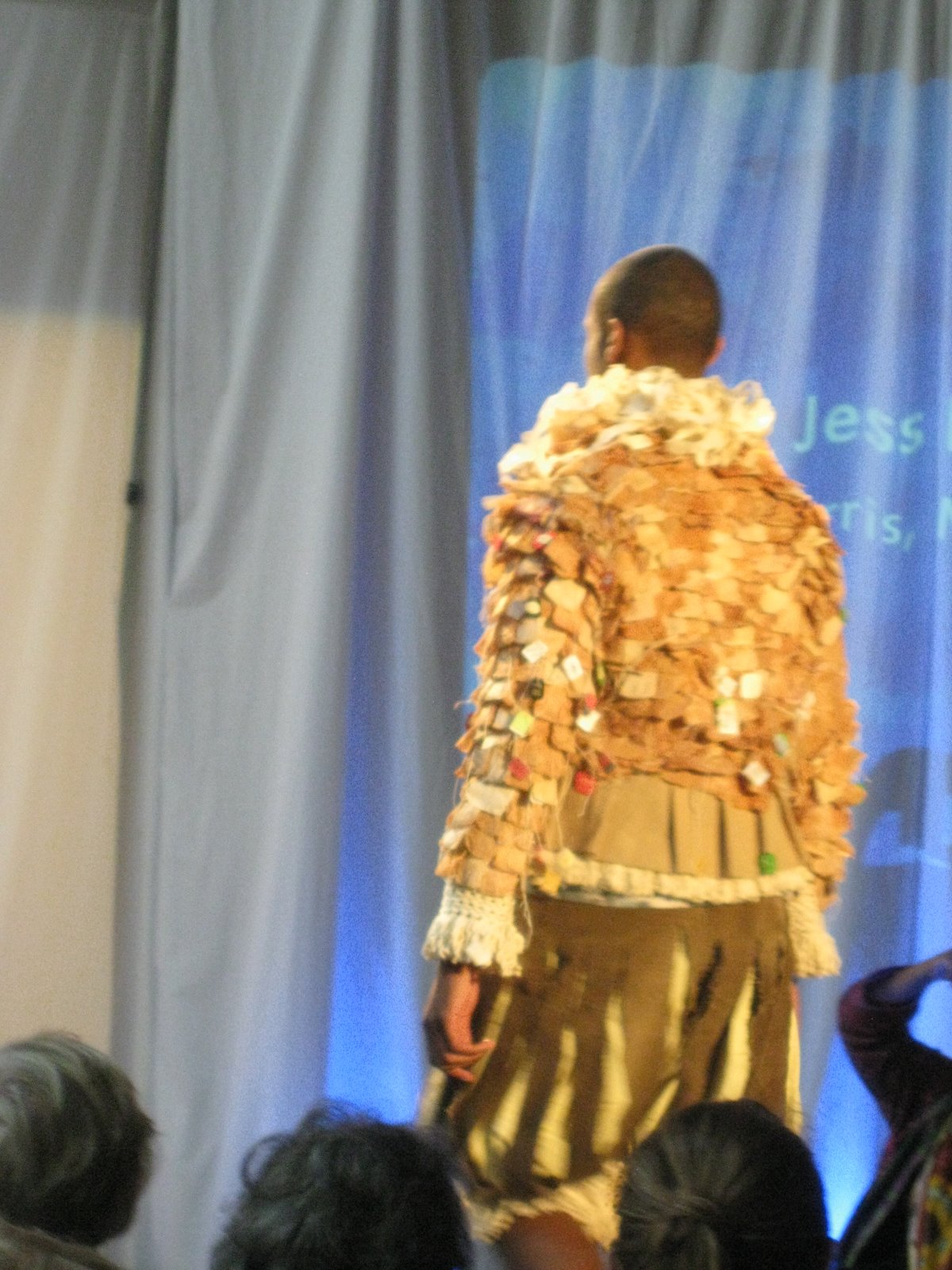 I felt there was some confusion in the focus of the fashion show. There were fashion garments that showed a wide range of surface design techniques but there were also wearable art garments, garments one wouldn't wear out in the street. The image shows Jess Larson's (Minnesota) used tea bag and paper jacket - a wearable art garment....