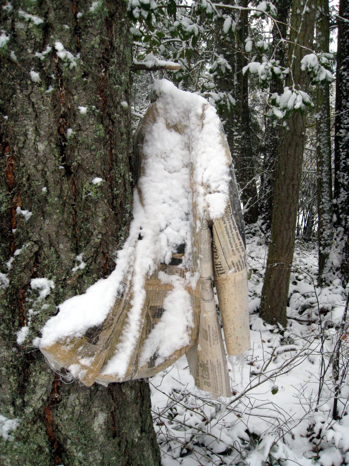 The cedar wrapped in cloth is in the forest where it is dark. There is lots of evidence of animals running over it and rearranging the loose ends.