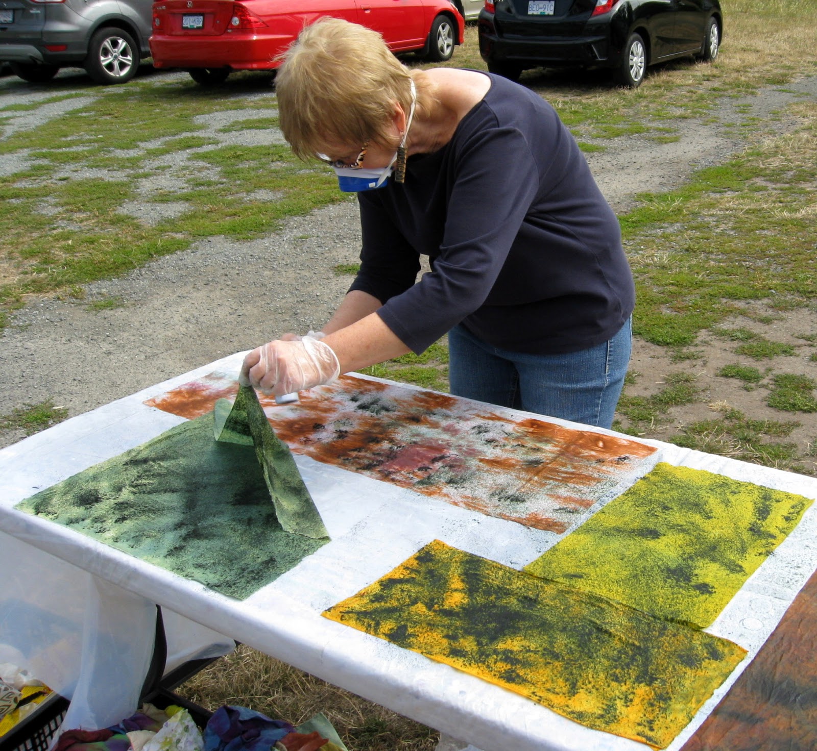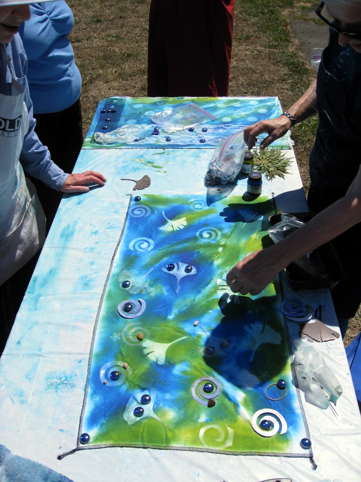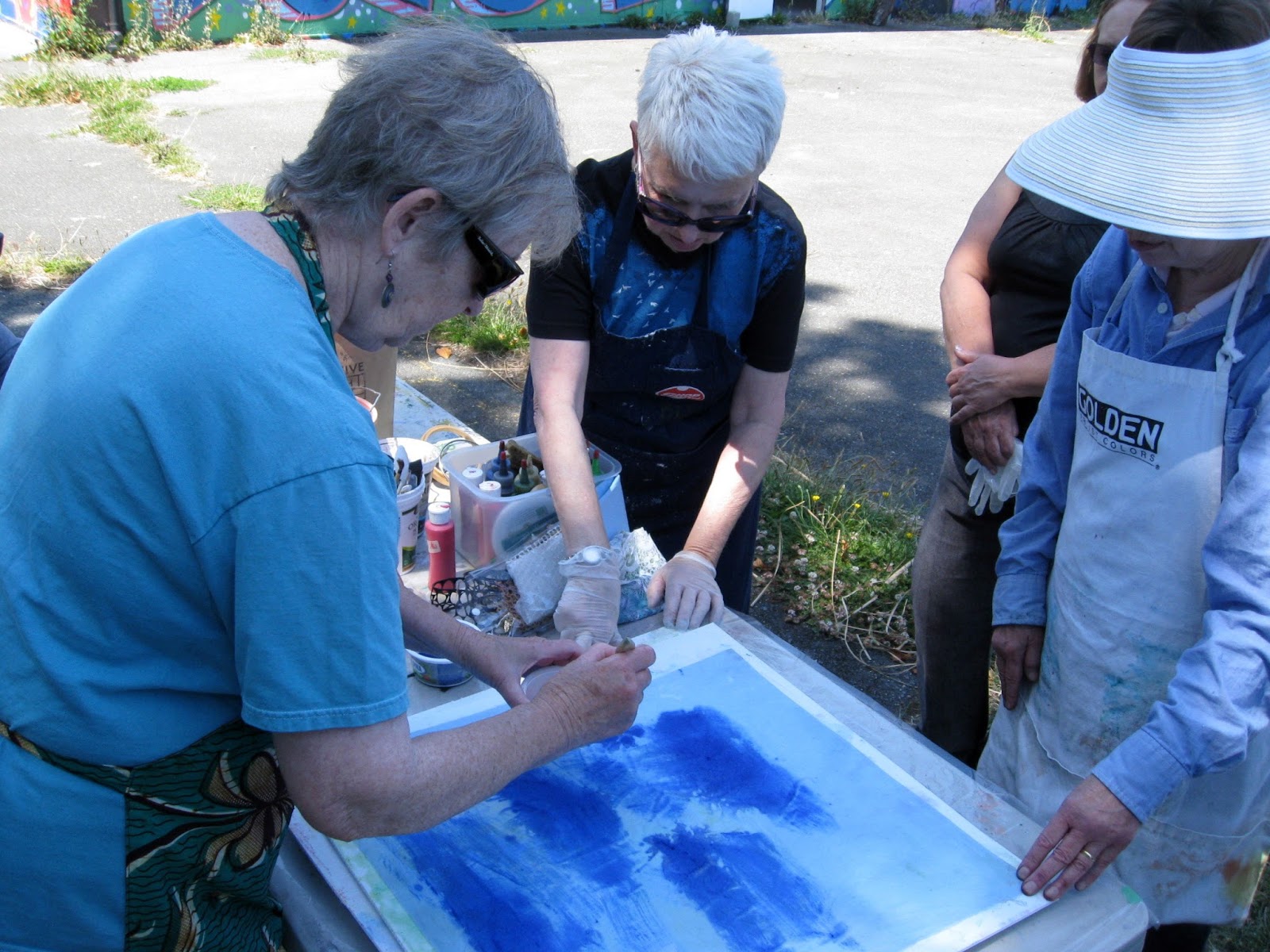 With the sun overhead, we all got clear impressions of the resists. Brenda is using plastic shapes she has cut out and leaves as a resist on linen fabric she has painted with fabric paint. Others used flowers, grasses, bubble wrap, paper and cotton doilies as resisits.