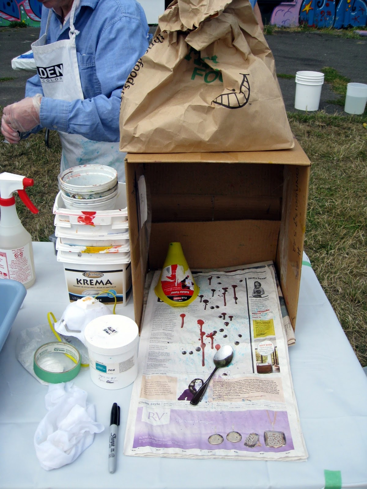 I set up my sophisticated system for working with dye powder safely and gave a quick demo on how to fill salt shaker-type containers with dye powder.