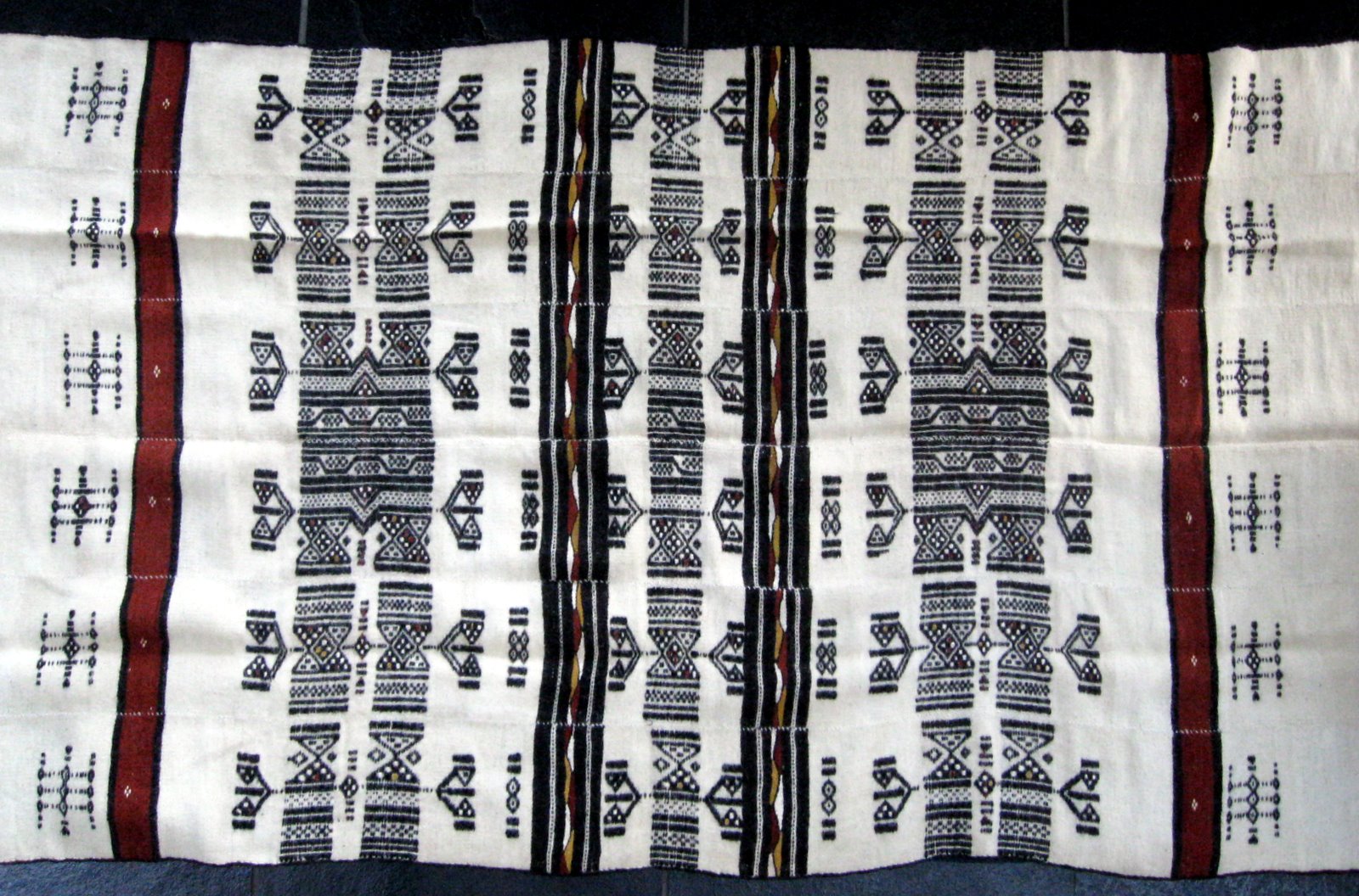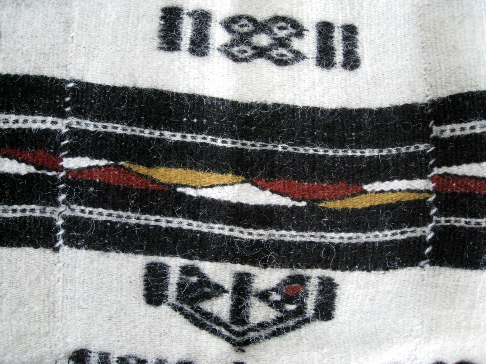It is woven in long strips then sewn together. The fibre is coarse, like goat hair.
