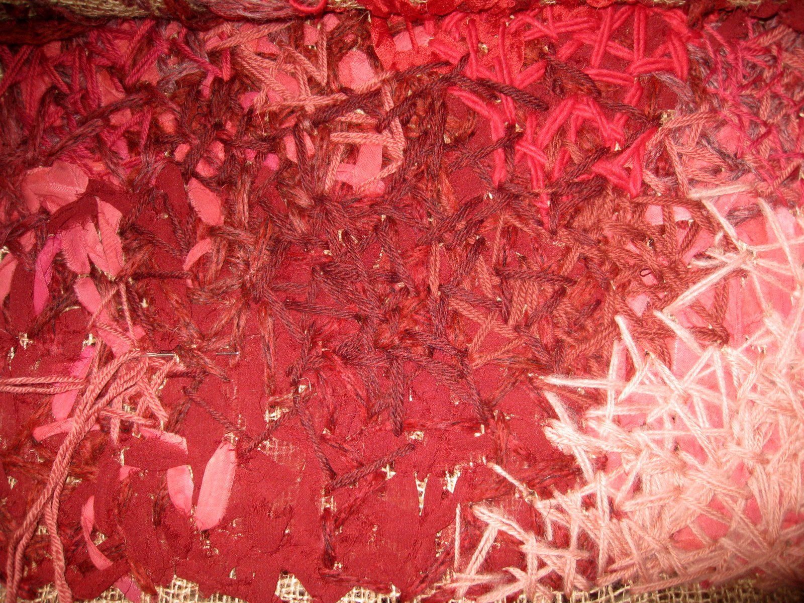 Showing progress on my 'Red' project - adding a layer of thick yarns over torn fabric strips.
