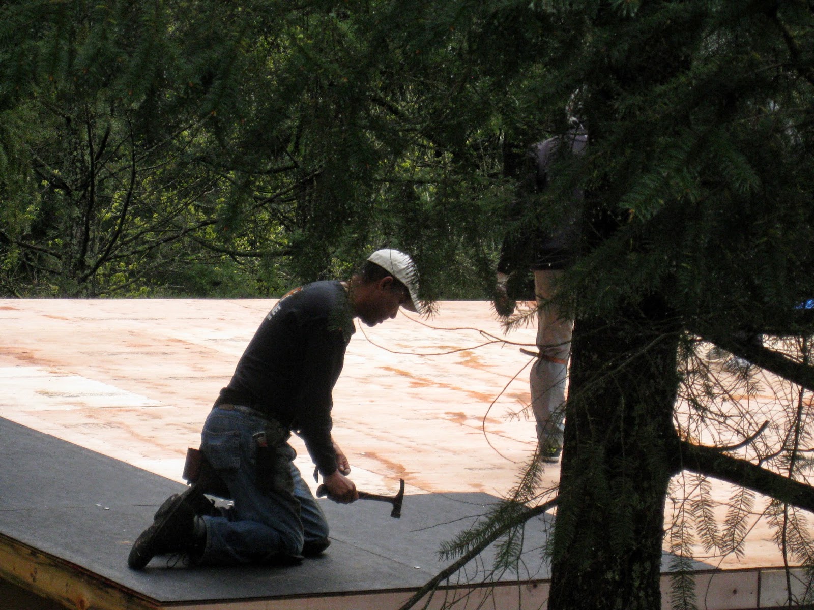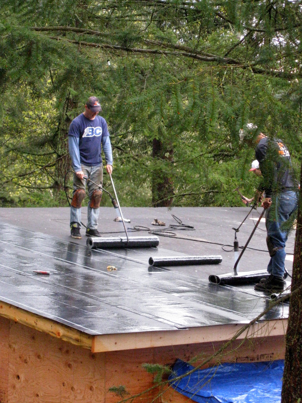 We decided on an SBS Torch-on roof. Here is the first layer being nailed in place.