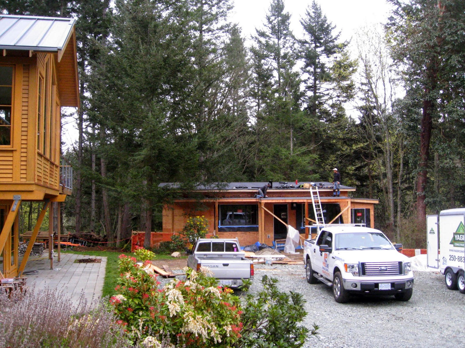 Initially, I had wanted a living roof to make it blend into the forest. We will see a lot of the roof from the upstairs level of the house. From my research on living/green roofs, I noticed most of them were planted in grasses or succulents. Grasses grow in a different ecology than rain forest and succulents require a much warmer climate. Planting either of these types of plants would require getting up on the roof to do maintenance replacing dead plants and lots of weeding. It would be too artificial, expensive, time-consuming and wouldn't fit with the native ecology. So no grass roof.