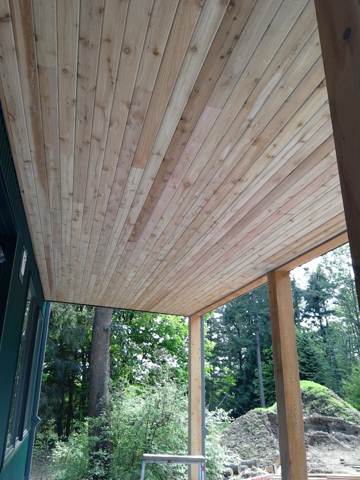 Dave is making the porch and arcade soffit from strips of rough finish, tongue and groove, western red cedar.
