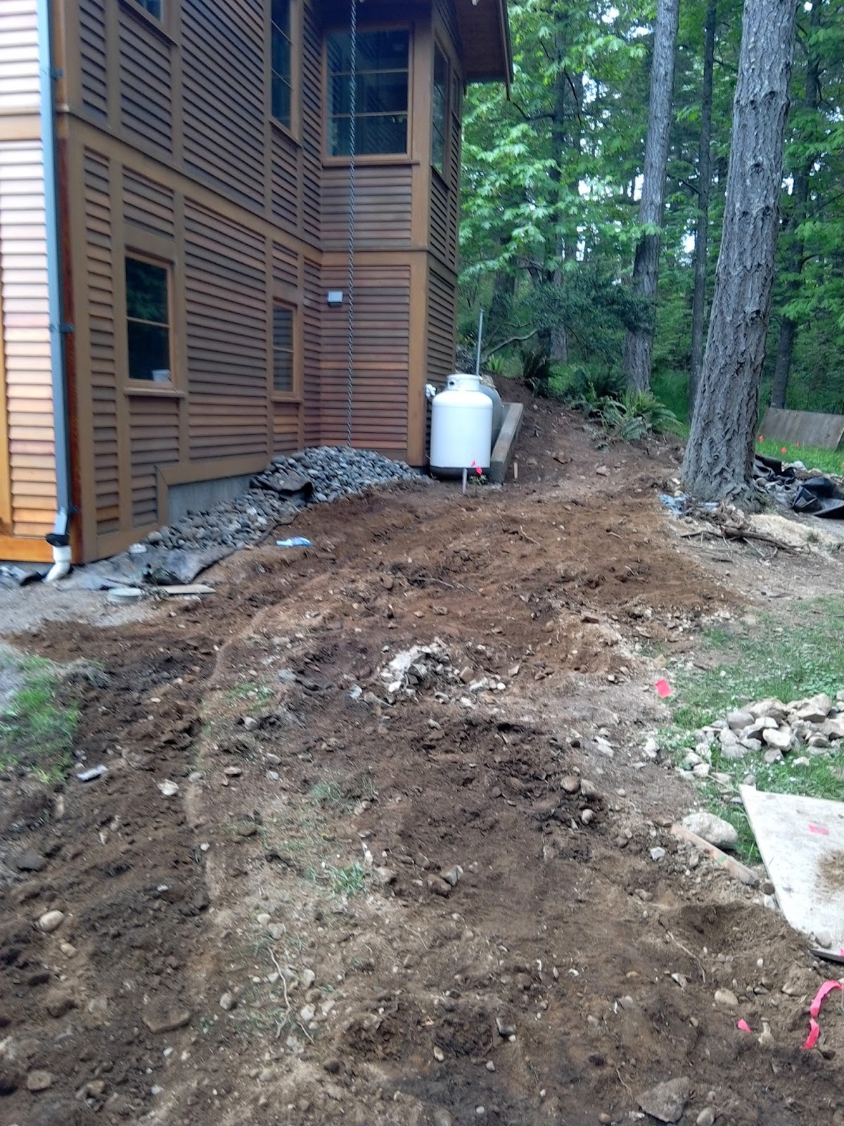 Meanwhile, we have finished backfilling the trench. I can now continue with building up the garden bed over the whole area.