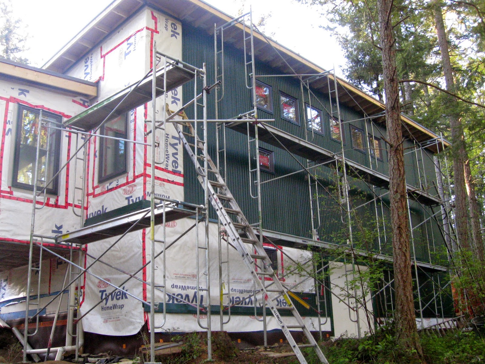 We went with wood framing because it is a locally grown and harvested material, but the construction method ensured all of the wood is enclosed within the building envelope, except for the cedar that I will explain later. Here in the rainforest exposed wood decays rapidly. It is how the forest ecosystem works. The metal cladding is the first protection layer of the wooden framework.