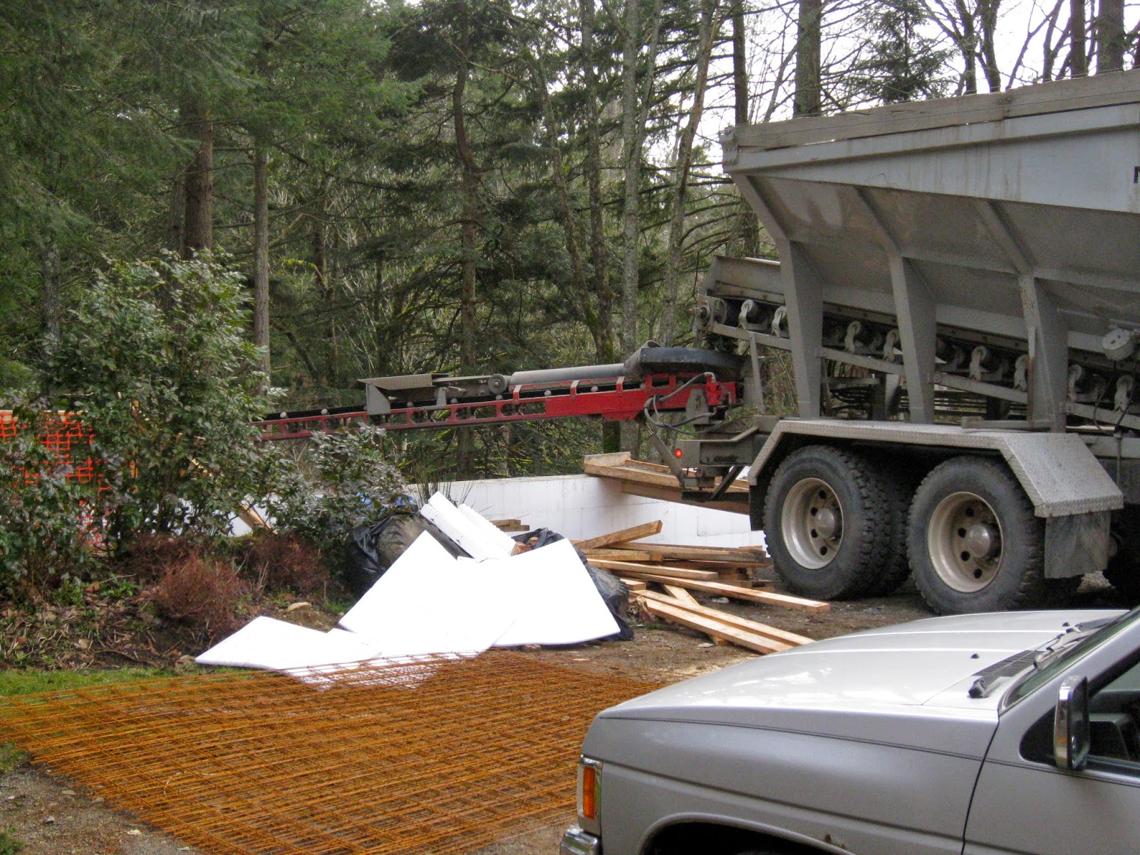 The driver stood on the crawlspace foundation and operated a remote controller. He directed a chute with a wet gravelly mix onto the floor. Dave and Jeff are ready with rakes in hand.