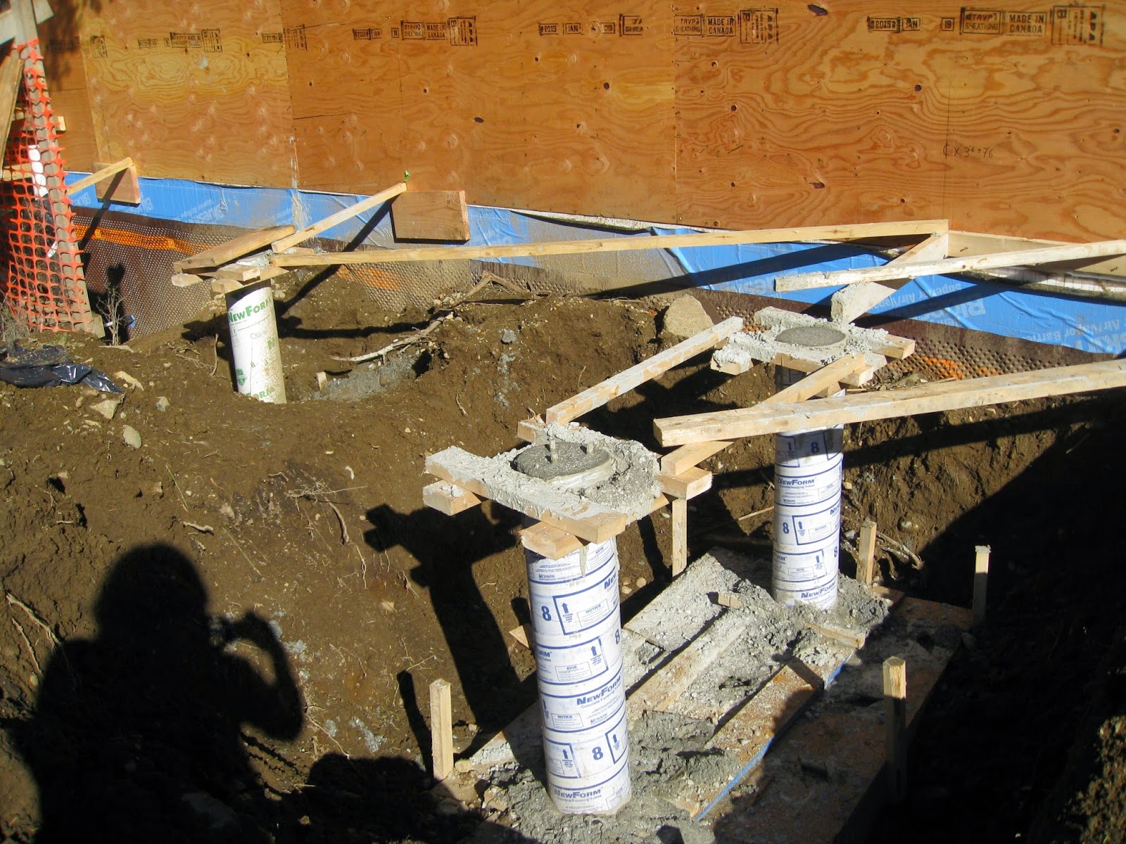 A digger was used to dig a trench in front of the building. Dave and James are in the trench framing up foundations and footings for the porch and arcade.