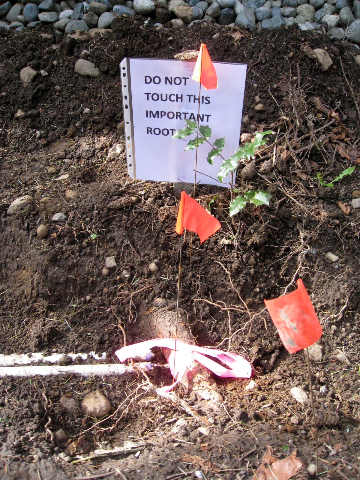 I am using hand tools to excavate around tree roots and existing irrigation pipes.