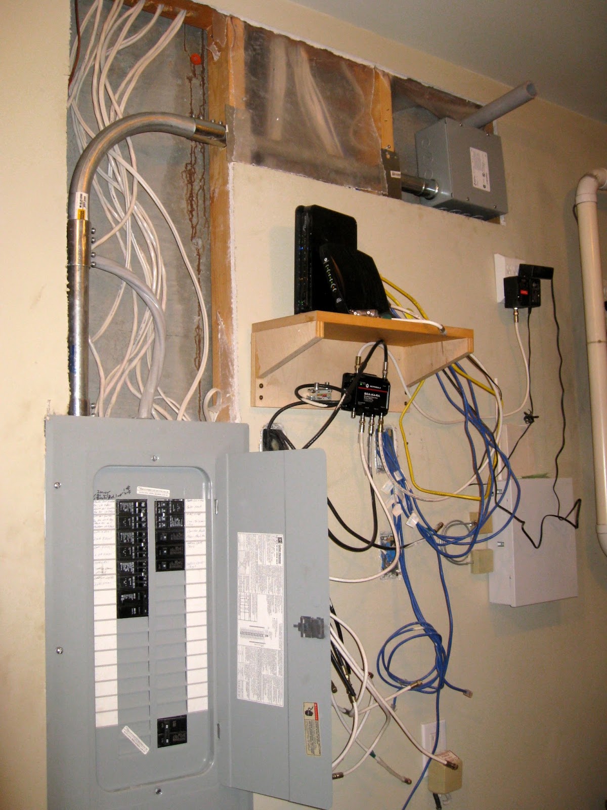 Meanwhile in the boiler/mechanical room connections were made with the power and communications cables. These went through the new holes drilled through the foundation walls.