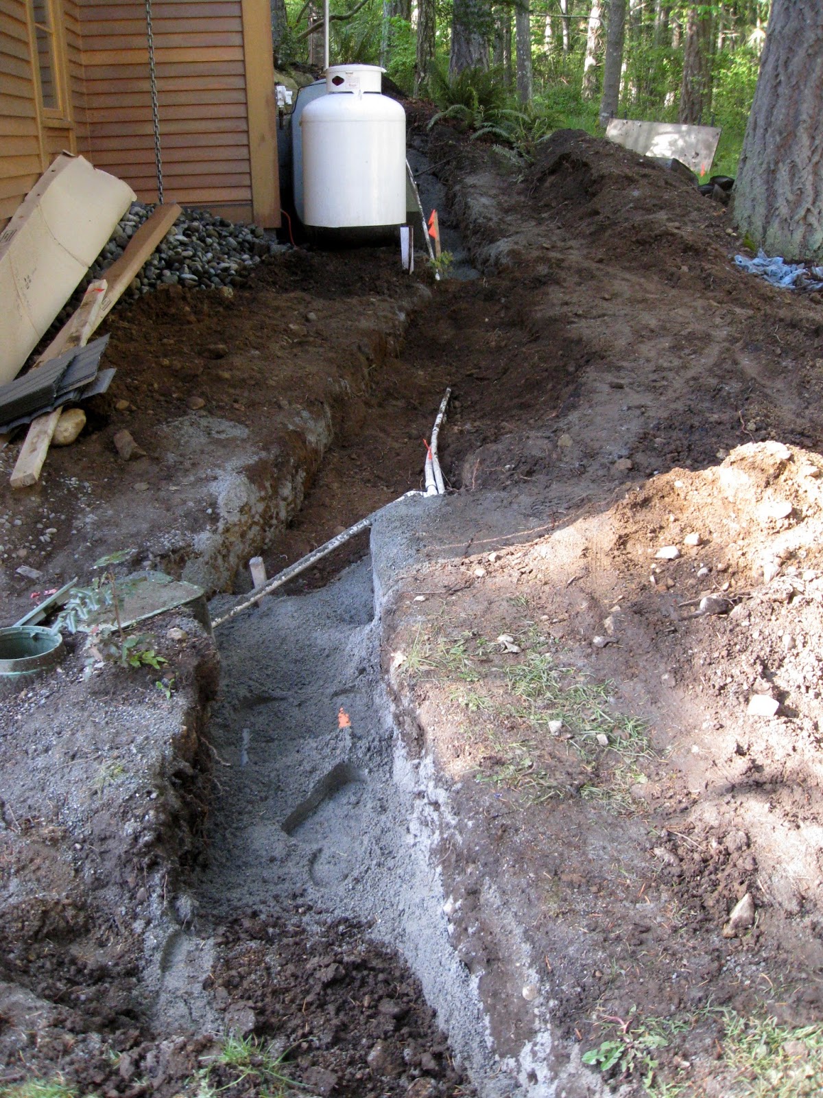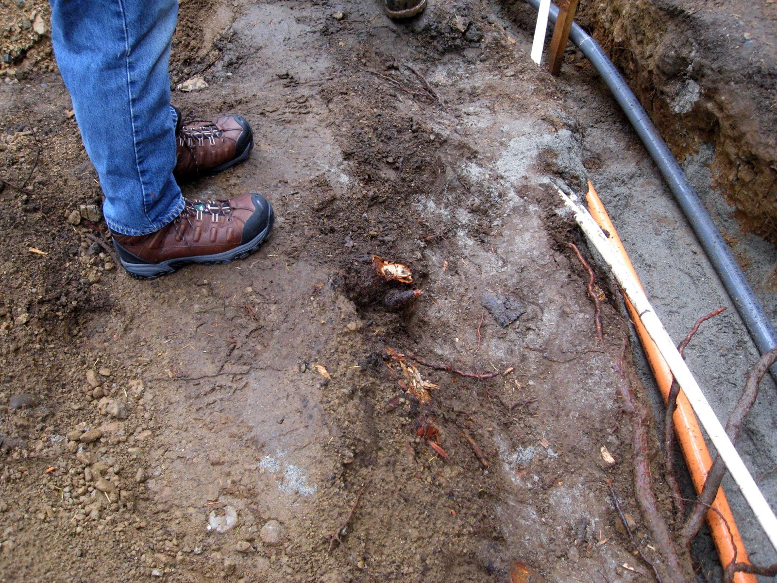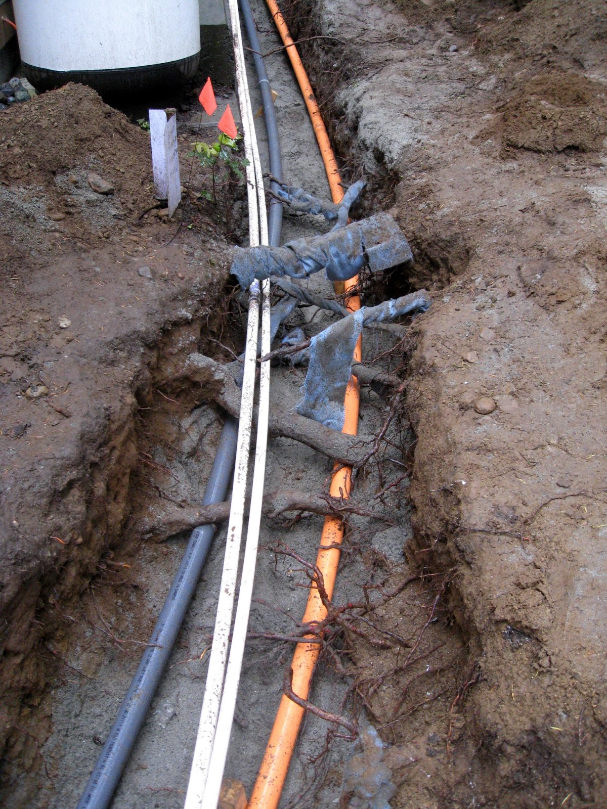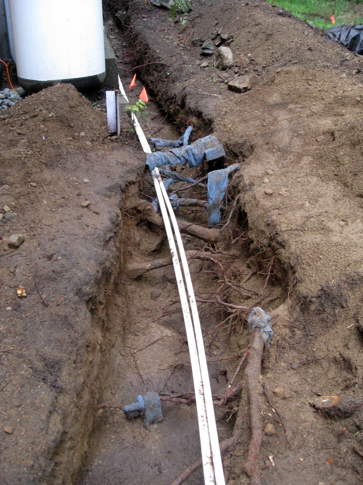 I worked carefully around the tree roots while digging the trench. I covered the exposed roots with strips of wet, wool blanket to keep the roots moist. Luckily we had a number of drizzly days which also helped keep the roots from drying out too much.
