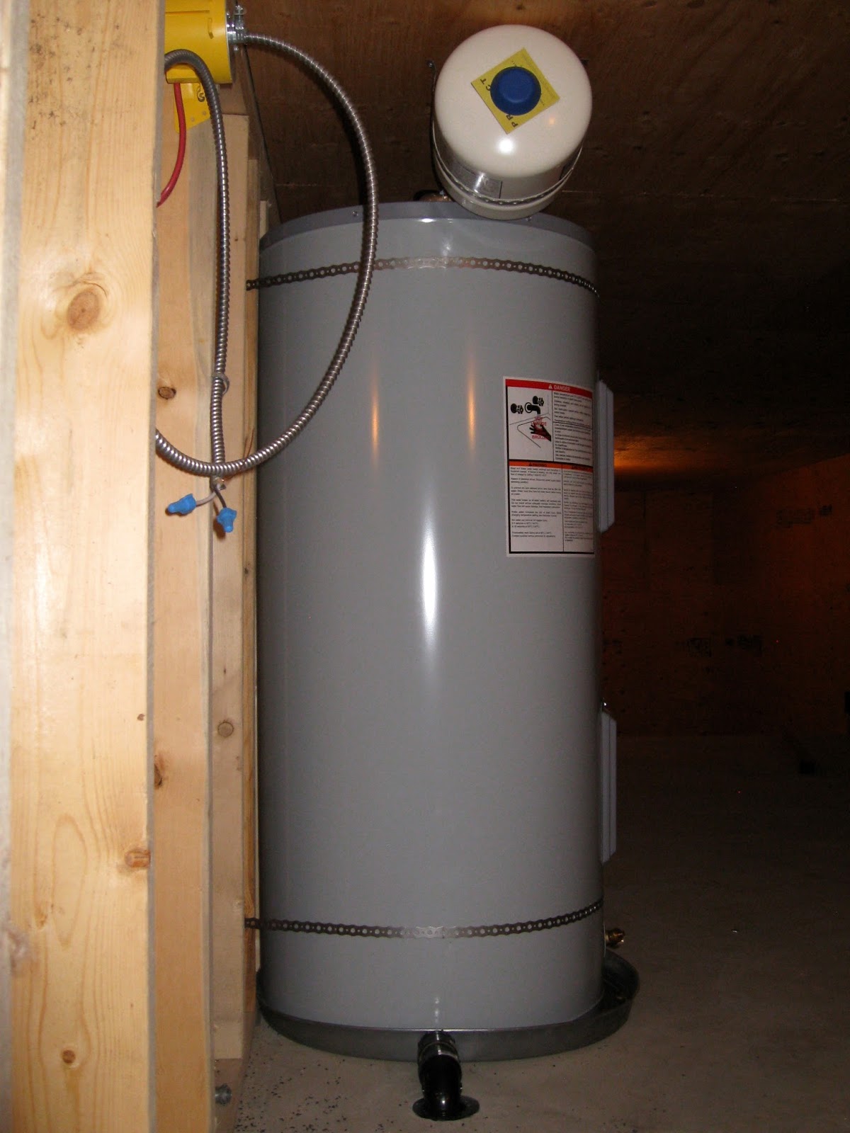 The hot water tank is installed in the crawlspace below the tub. This energy efficient placement means little heat is lost between the hot water tank and where I need the hot water.