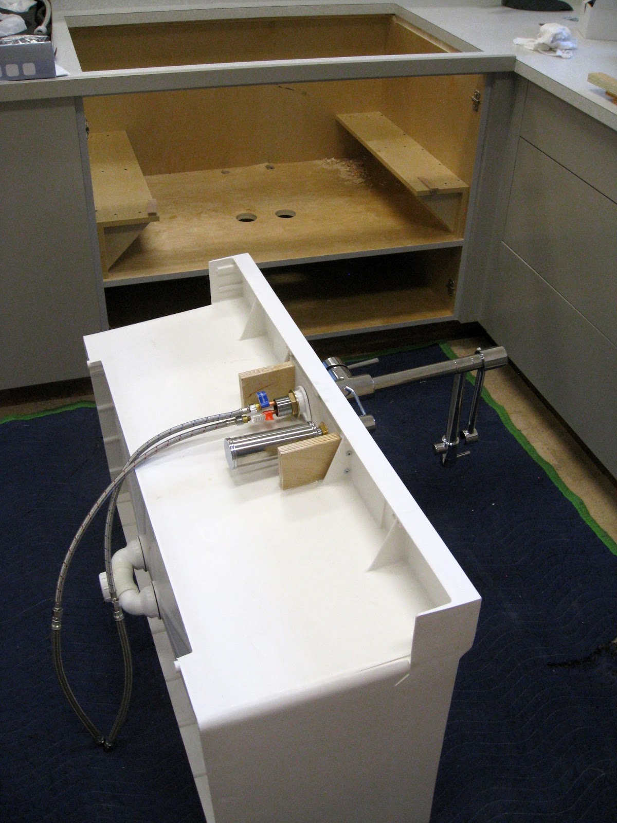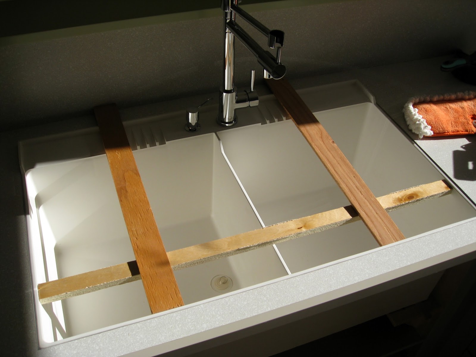 The tub is braced while the sealer cures.