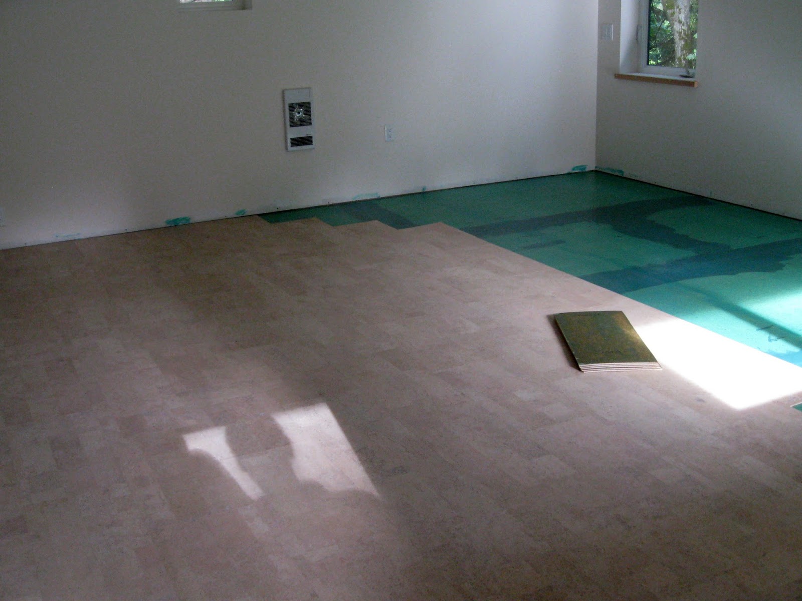 Next step, a thin layer of the green adhesive is rolled onto the subfloor and left to dry. Then the tiles are laid down. Pressure applied to the tile activates the adhesive to make it stick.