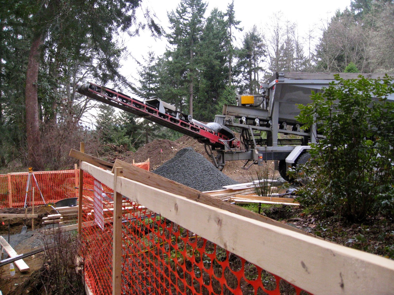 The truck unfolded a conveyor belt from it's back and dumped a wet, gravelly mix in a pile.