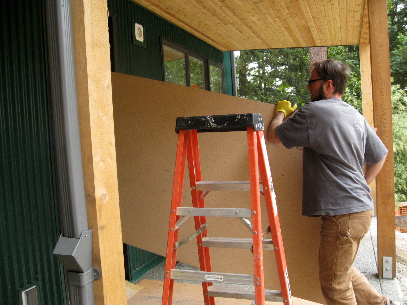 atelier design + build, dropped off the flooring underlay panels. They need to be kept inside the studio for at least a week to adjust to the moisture level inside. Ron has kept the dehumidifier going and it continues to extract buckets full of water. He does regular checks with his moisture reading tool hoping to see a drop in the plywood floor moisture levels. It looks as though water is now being drawn up from the crawlspace so the dehumidifier gets moved downstairs every few days, then back upstairs.