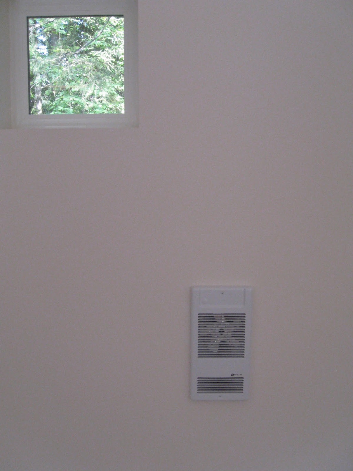 The electrician visited and installed the heating - 2 tangential fan units either side of the design wall. They are connected to a thermostat so they can be set to come on automatically. I will also have a remote starter connected to my cell phone so I can turn on the heaters while I am in the house having my breakfast so the studio will be warm when I get out there.