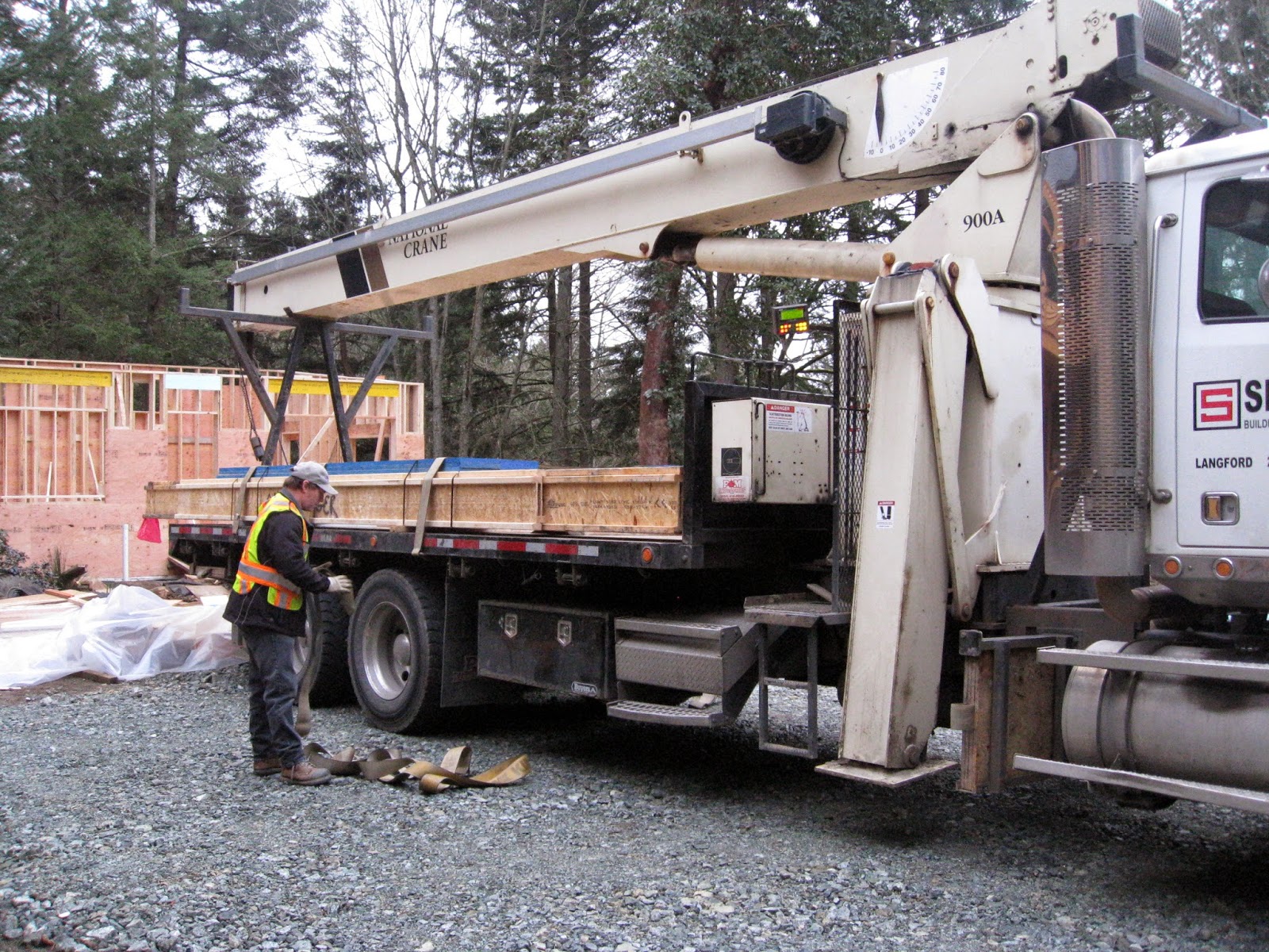 Dave guides a bundle of beams as they are taken off the truck bed.
