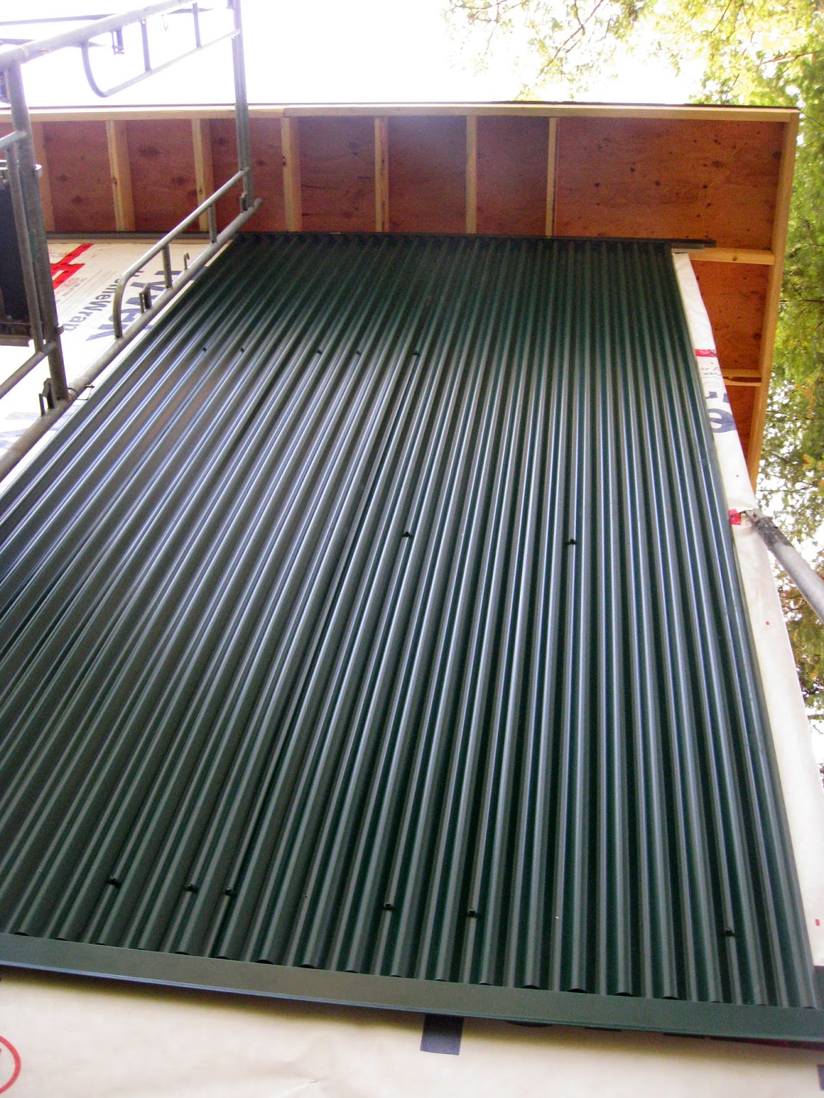Back to the studio. The large east wall has its first panel of corrugated sheet metal cut, shaped and attached. It looks fabulous.