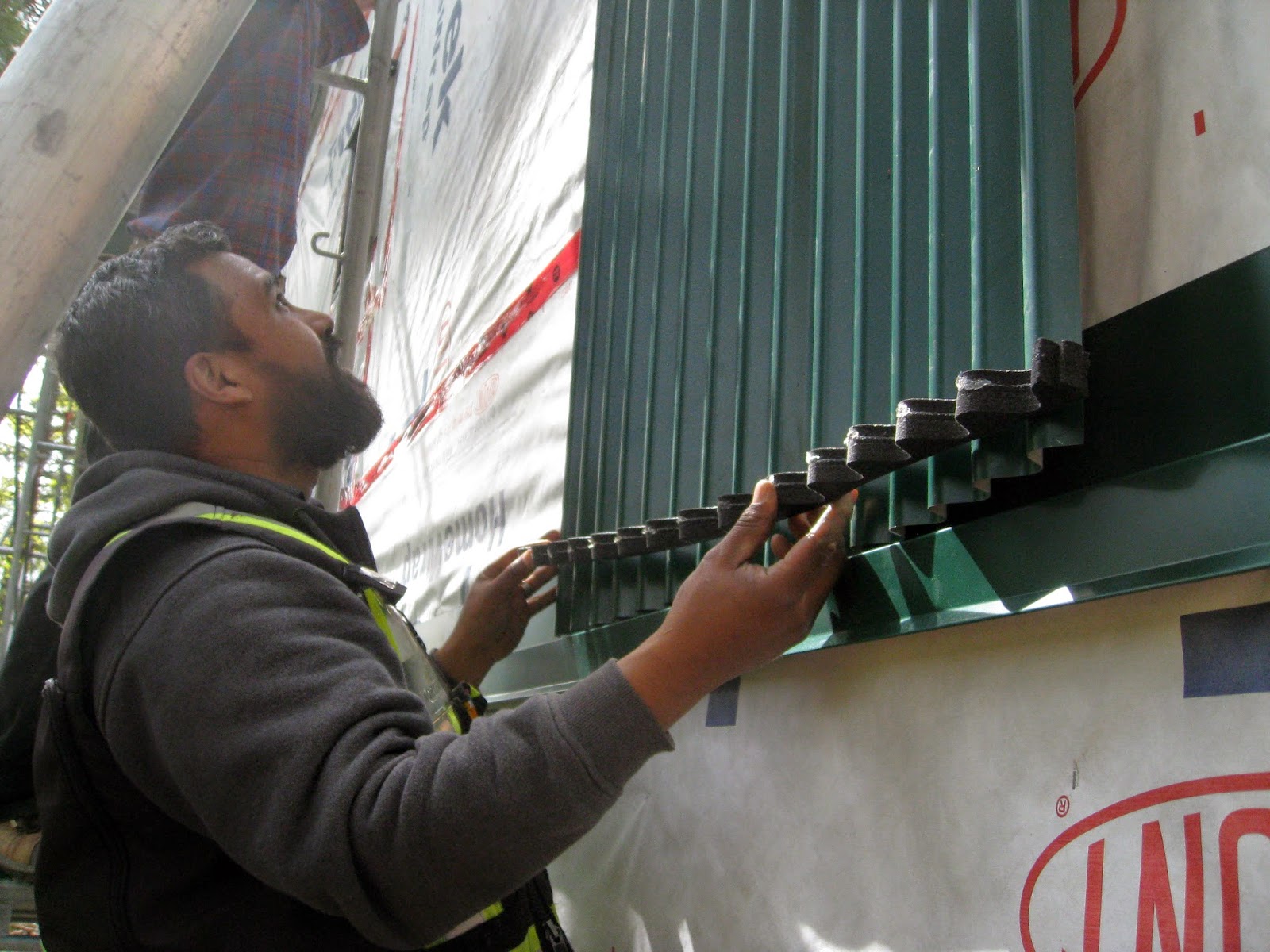 Alex instals a sticky foam strip with the same shape as the metal panel. It is stuck in behind the bottom of the panel. Its purpose is to stop the bug world from inhabiting the spaces between the metal and the Tyvek. No insect condominiums available here.