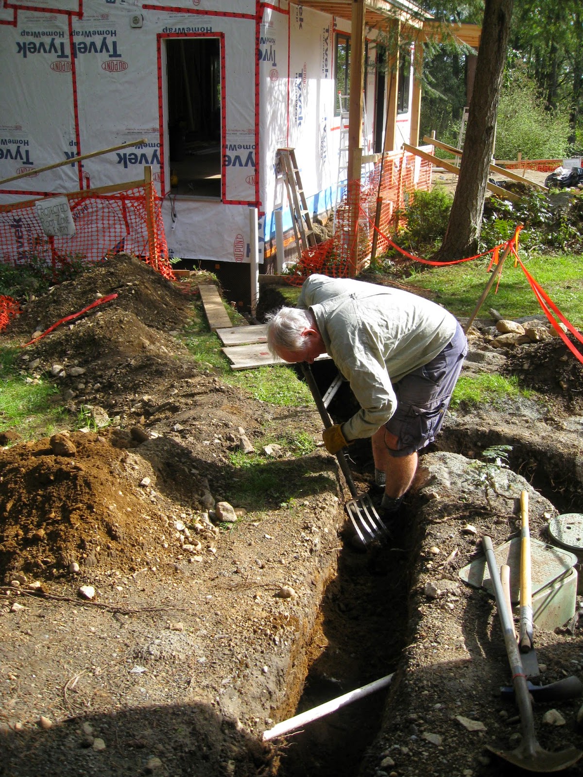 Meanwhile, back in the trenches... I had covered the exposed roots with wet coffee sacks to keep them from drying out. But the coffee sacks must be treated with something because they don't hold any water.