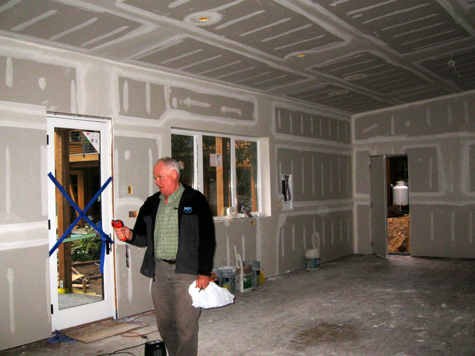 Ron uses a moisture probe to test the moisture content of the materials. The building's floor, concrete and wood frame were open to the winter rains during construction and absorbed a lot of moisture. The wet plaster has added to the interior moisture level because it gives off a lot of moisture as it cures and dries. The overall moisture level of the building interior needs to be reduced before the next stages can begin. Ron has installed a dehumidifier that runs day and night until he gets acceptable moisture readings.