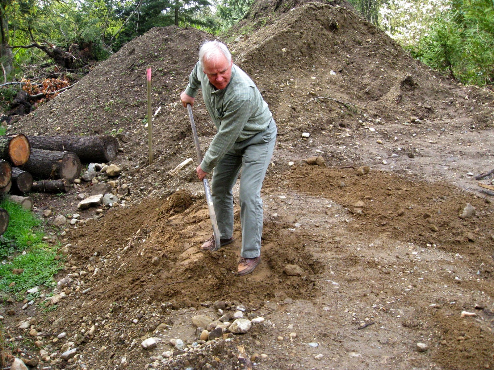 This is B horizon soil from the site excavation. With all of the site activity, including being driven over by many large, heavy delivery trucks, the soil has become very compacted. Rain no longer penetrates, instead it pools on top. It will be dug up later to backfill around the building and compacted again. The soil piles behind Ron are precious top soil for garden beds.