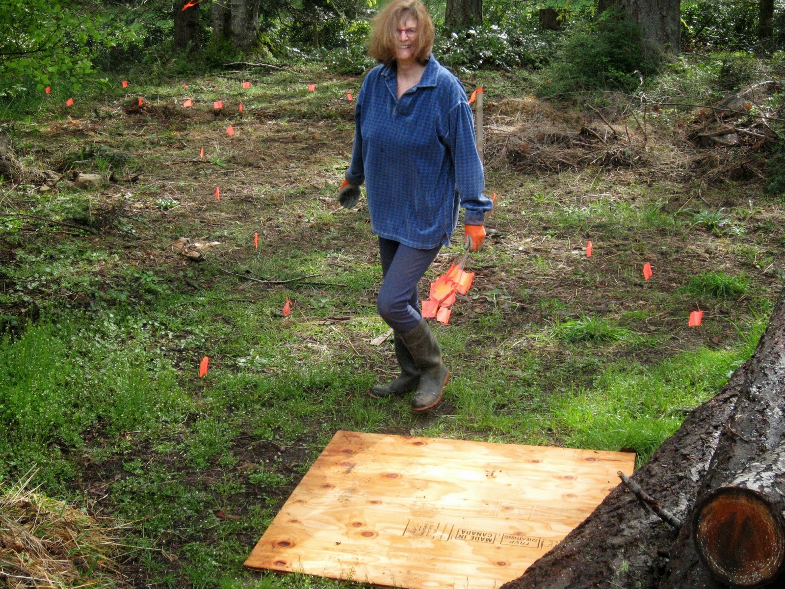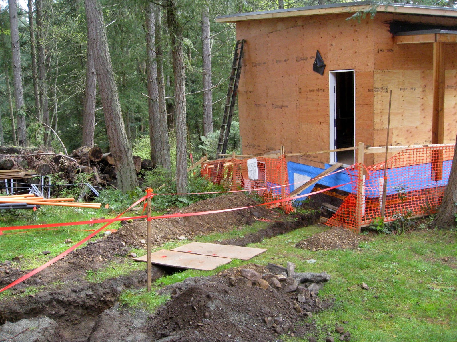The cladding team will need to get access to the back of the building while carrying large sheets. There isn't enough room down the sides of the building to do this. Up until now, all work has been restricted by temporary fences to keep people and materials out of the sensitive forest areas. Compaction by foot traffic and the dumping of materials causes major issues with the health of the soil.