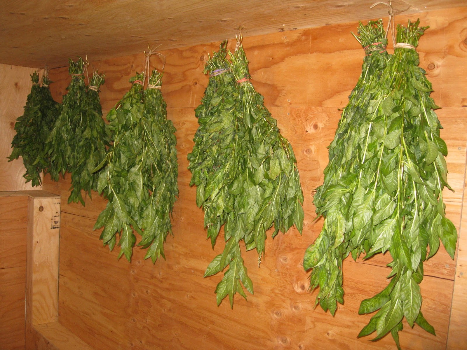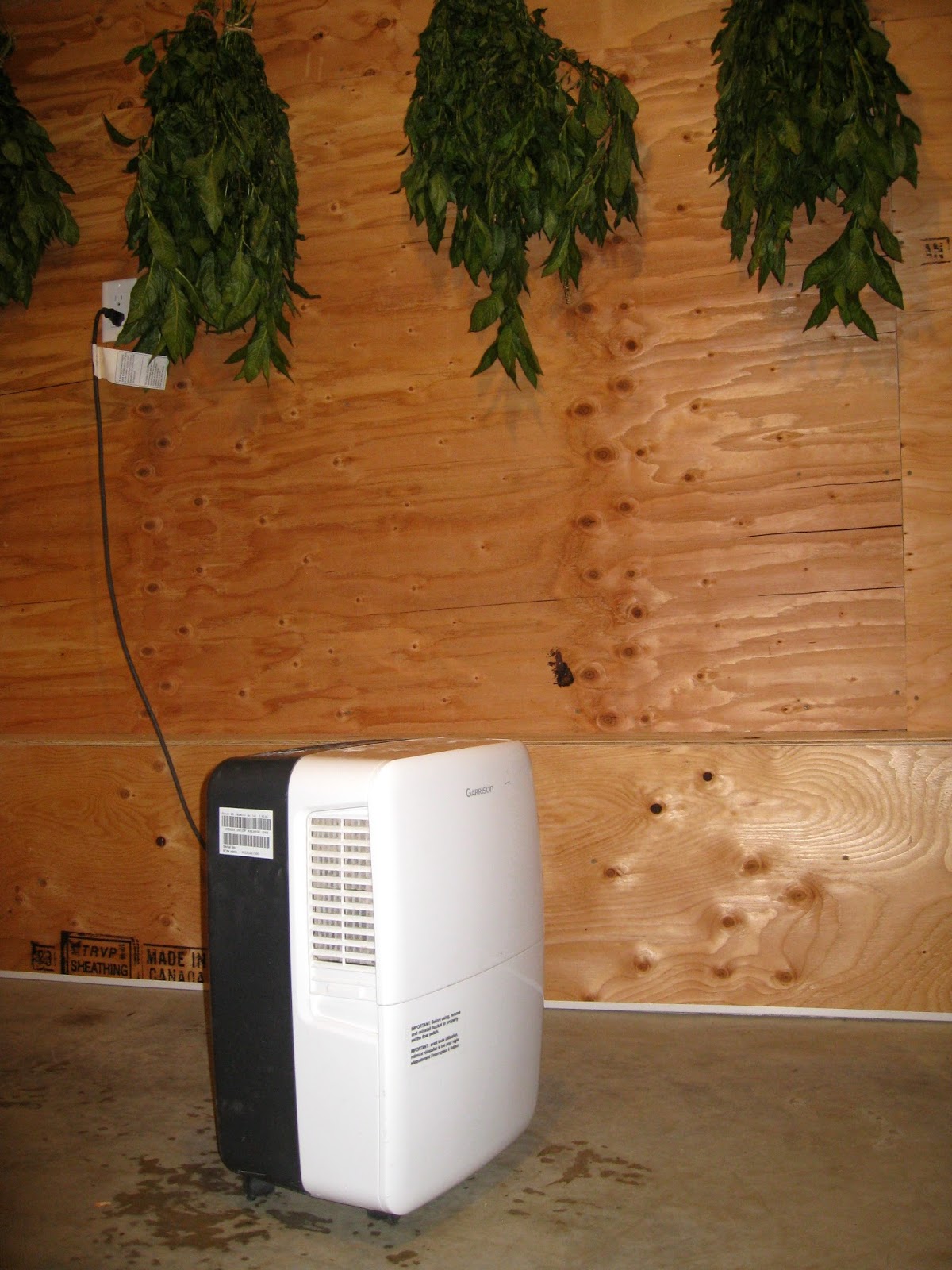 I moved the dehumidifier nearer the bundles to create air movement to stop any mold or mildew (probably the same thing) from forming. The dehumidifier took out of the air the extra moisture created by the drying plants.