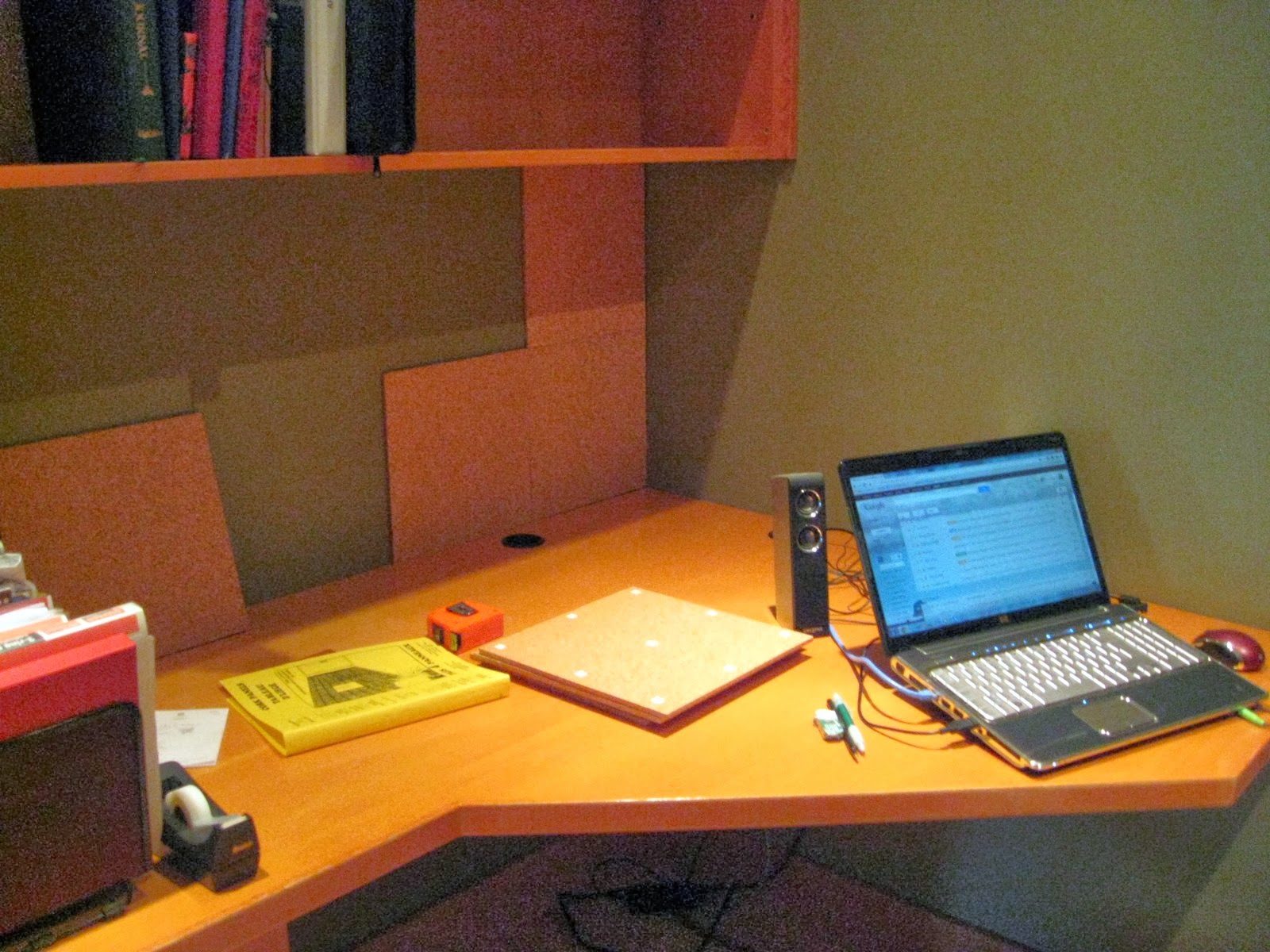 Over the summer I have been reorganising my work space.My husband noticed most of the times when he visited me in my studio I was sitting at the desk with the computer. Computer tasks seemed to take priority over making work.Husband suggested I move my computer activity outside the studio to a corner desk area we had set up for guests to use.I thought that was an excellent idea.My computer is now installed in its new location and I am putting up cork tiles for a pin board.