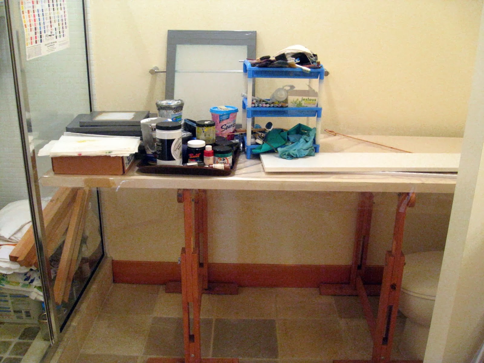 My wet studio is the bathroom off the bedroom that is my work studio.Next step was to plan the most efficient use of this space.