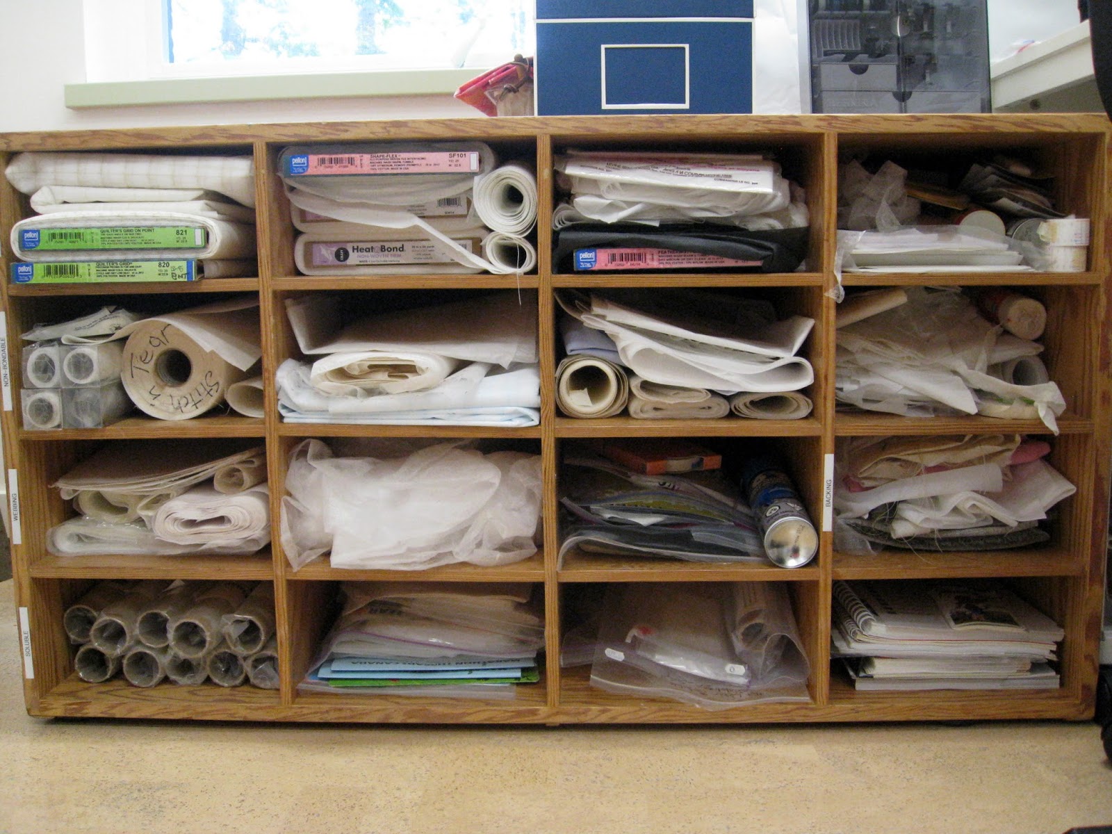 I like old 50s to 70s government issue furniture. It is usually well worn and very functional. This old map cabinet is where I sort and store stabilisers only a chair swivel away from the sewing table