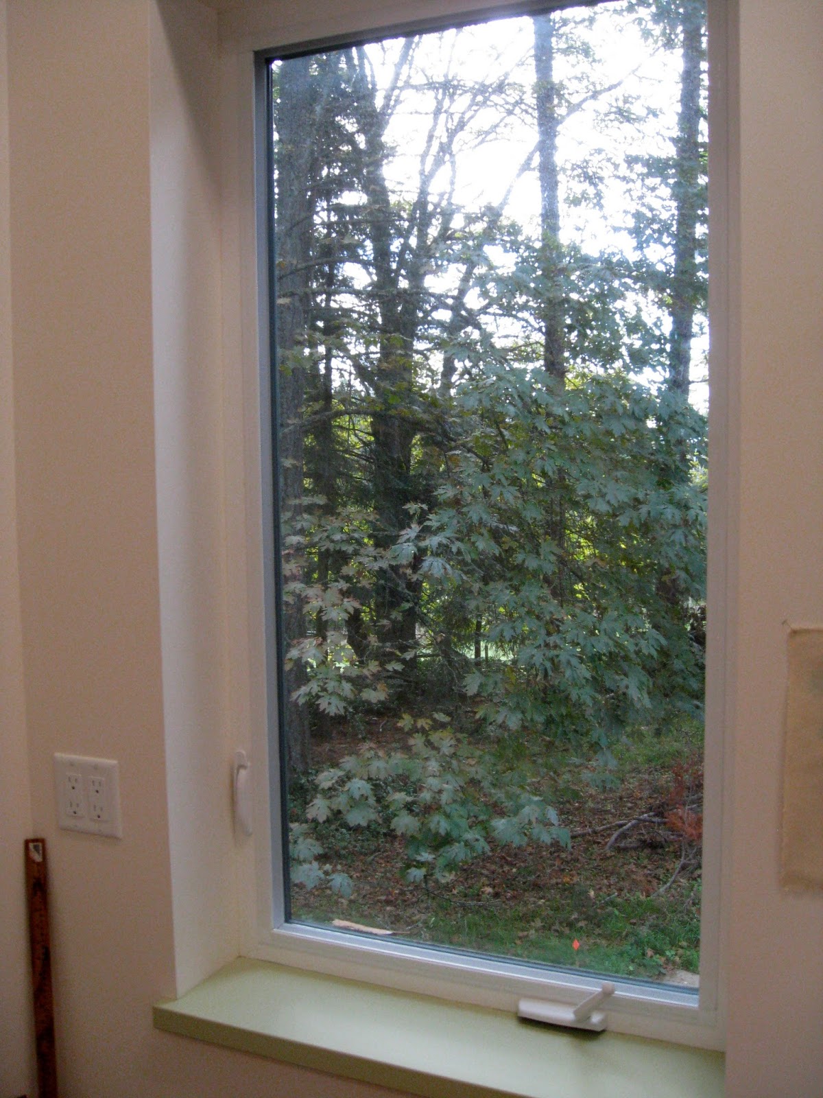 Over the cabinet is a window with a view of the forest. It lets in soft south easterly light and keeps me in touch with what is happening outside.
