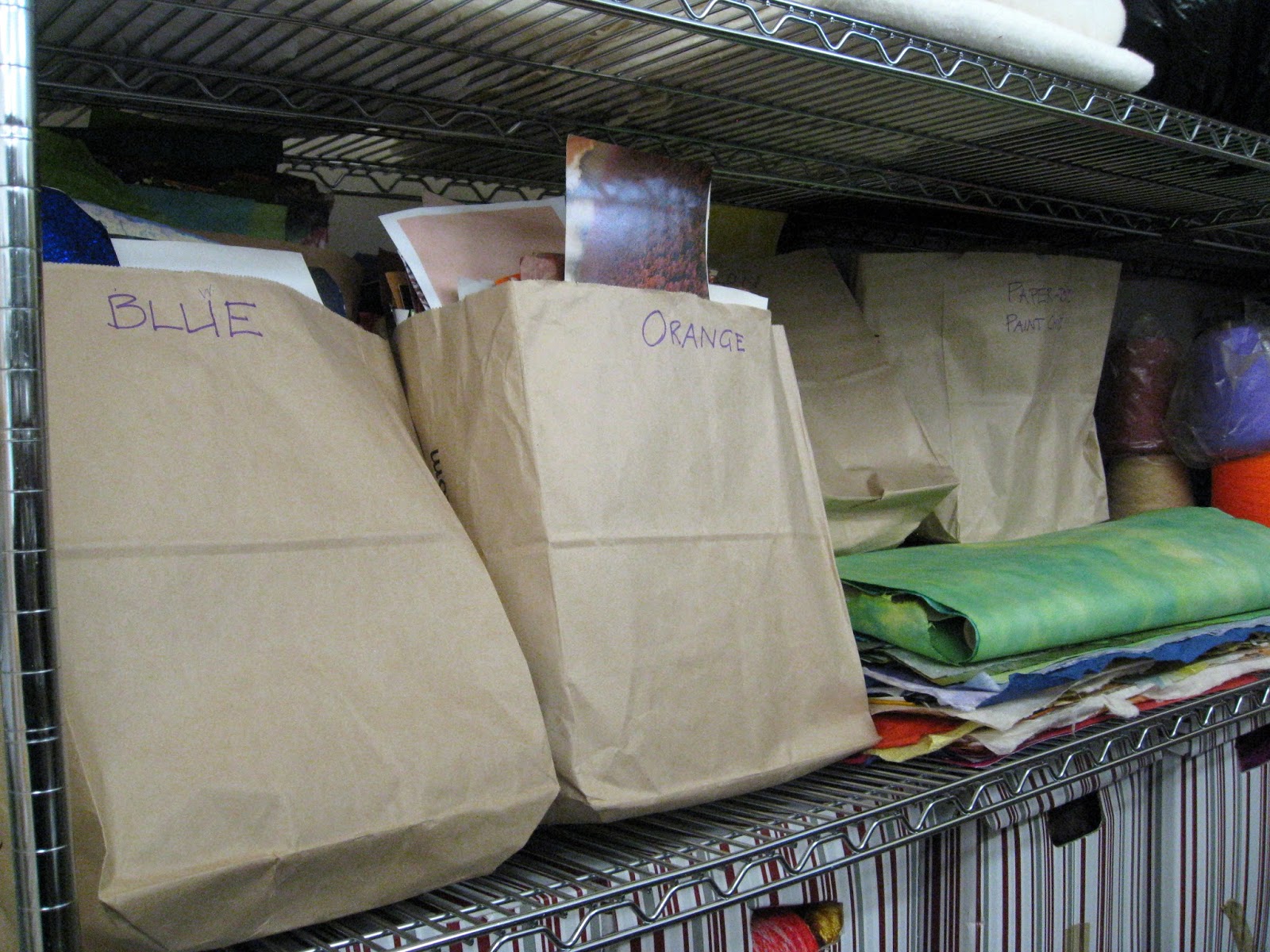 I have decided to store things in used paper and cardboard, like these grocery bags for painted papers.