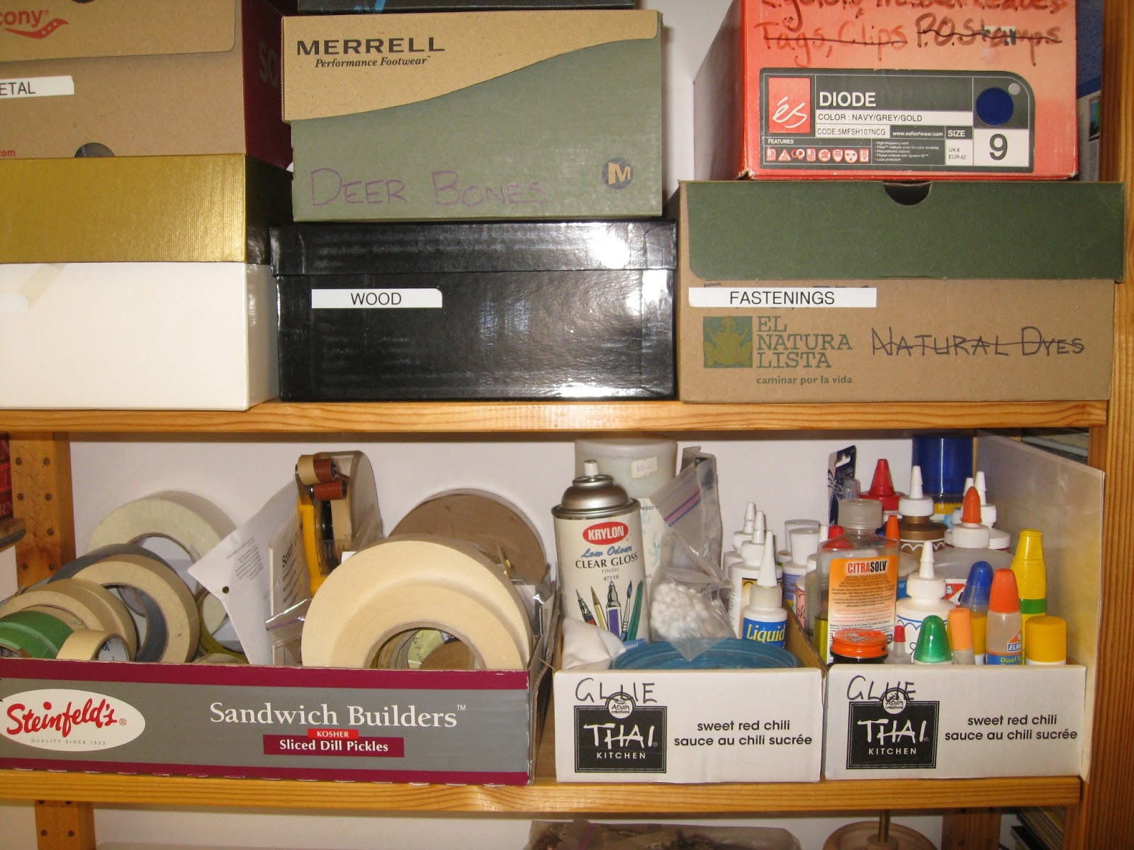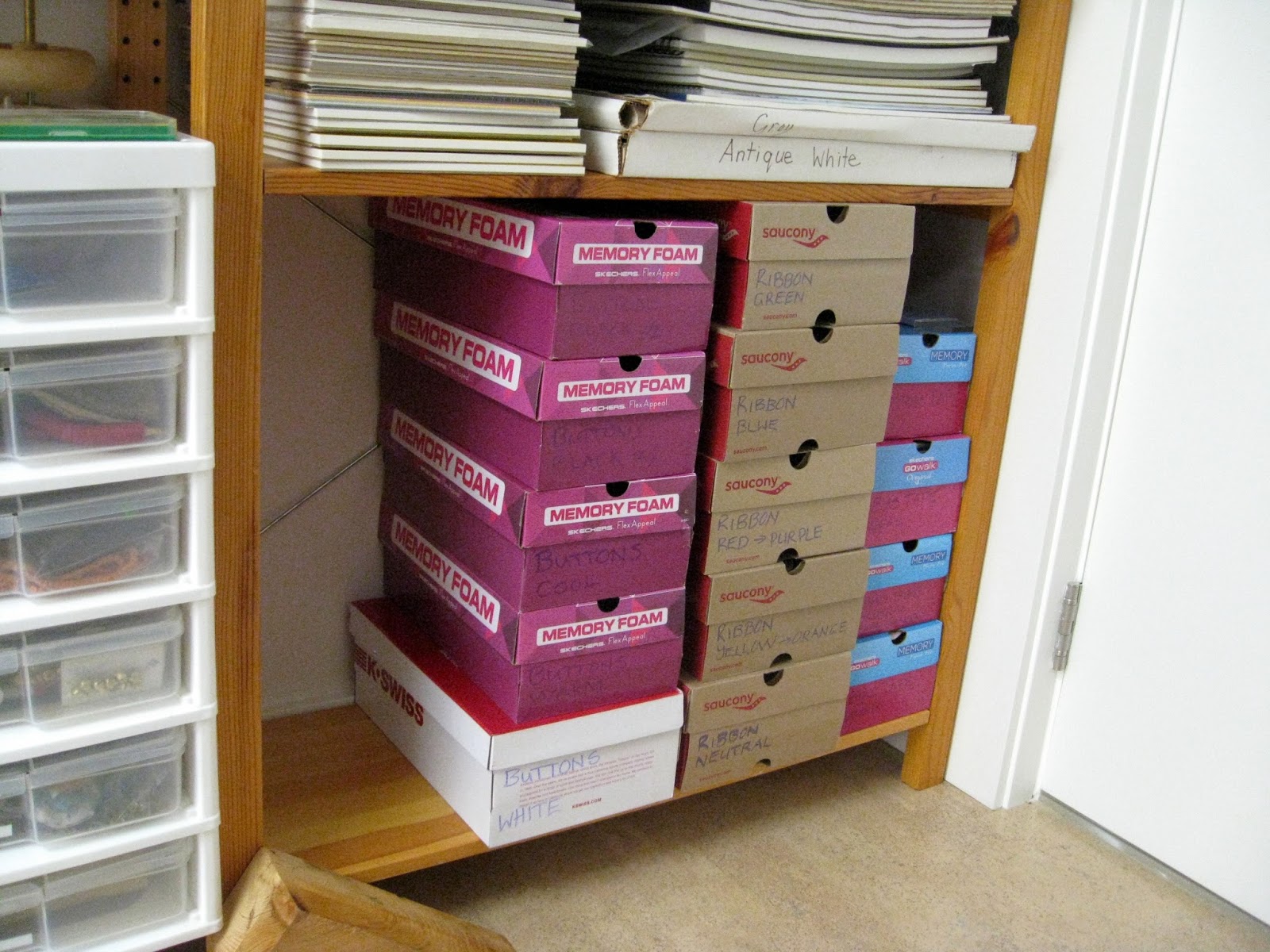 I raided a shoe store's supply of empty boxes. I think the owner was pleased he had fewer boxes to flatten after I left. Yes, it does look like a shoe store but it is a most convenient way to organise my many collections of precious things.