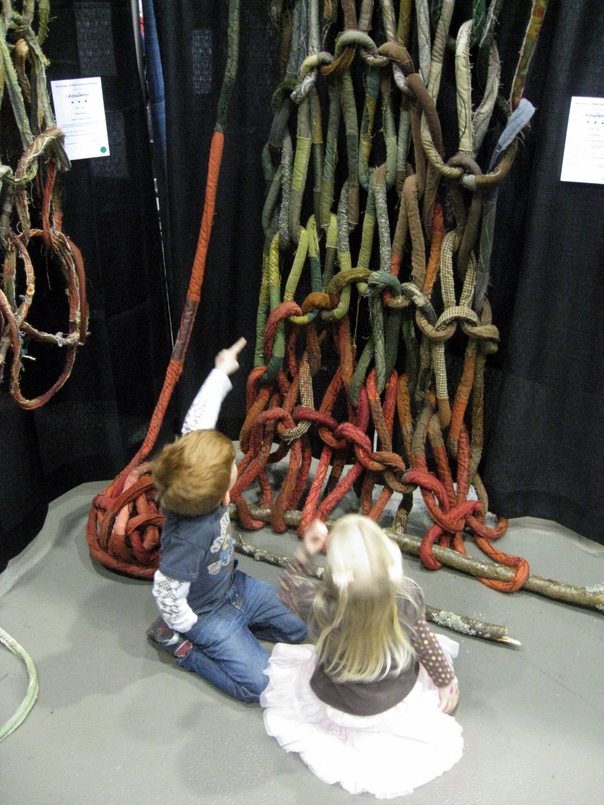 Over a number of earlier posts I showed you the development of some work for Articulation's Rain Forest body of work. I couldn't show you the finished work because we had a contract to have a certain amount of new work at the Canadian Quilters' Assoc conference in Calgary. And here they are, out in the world for the first time. On the left, 'Regression', on the right 'Succession' Once it was hung I was thinking about how they were made to be suspended from a ceiling, to be viewed from all sides. And how they don't look as full of life against black curtains with low light.