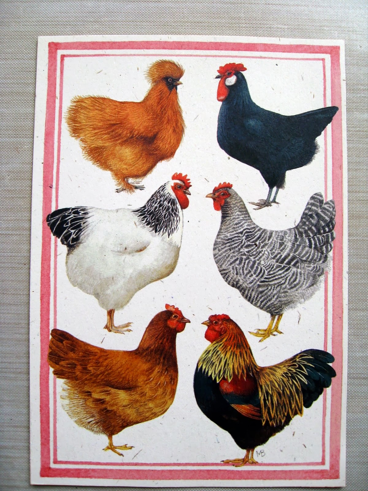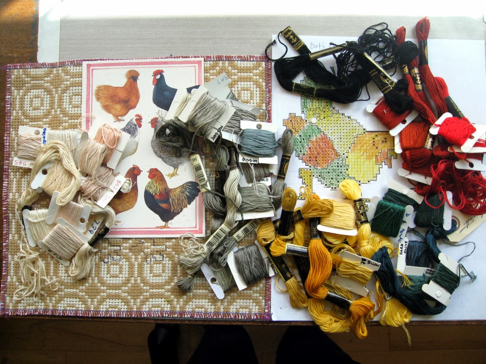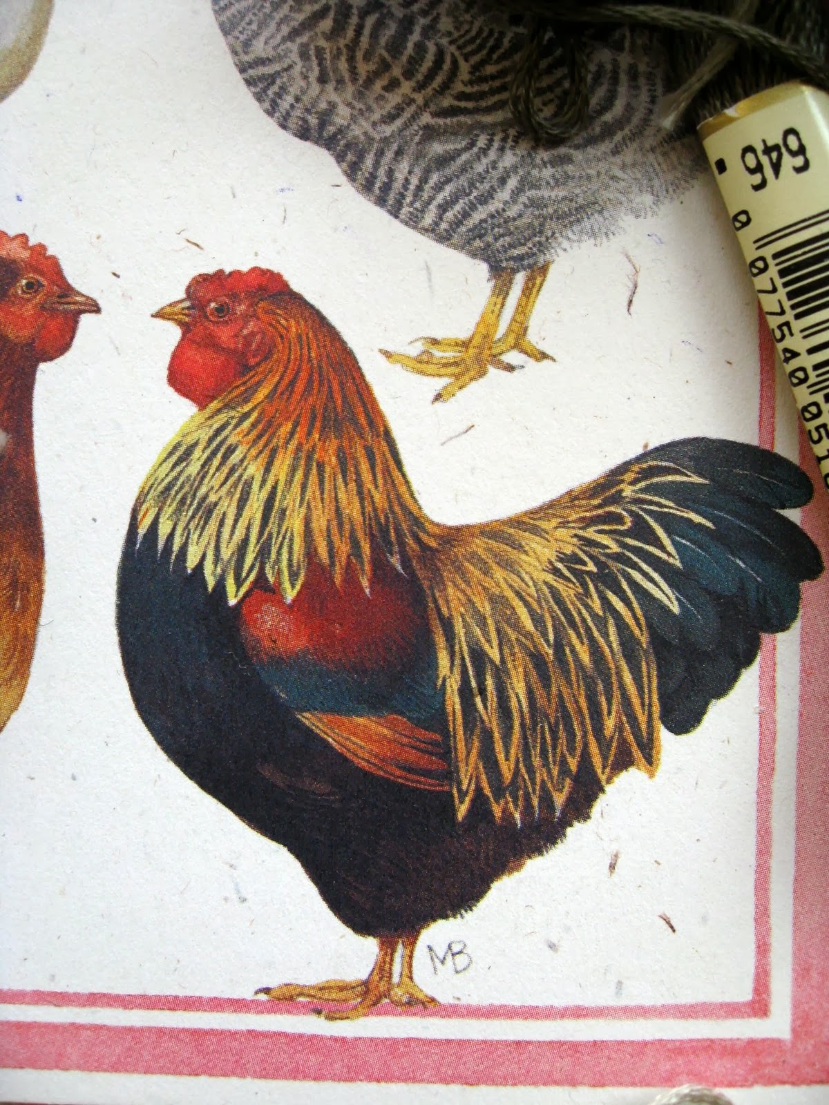 Early summer I made up a 'To Go' project, something I could take with me to work on while travelling.It had to be self sufficient, small and take a long time.I started with a card a friend sent me for inspiration. She knows I love hens.