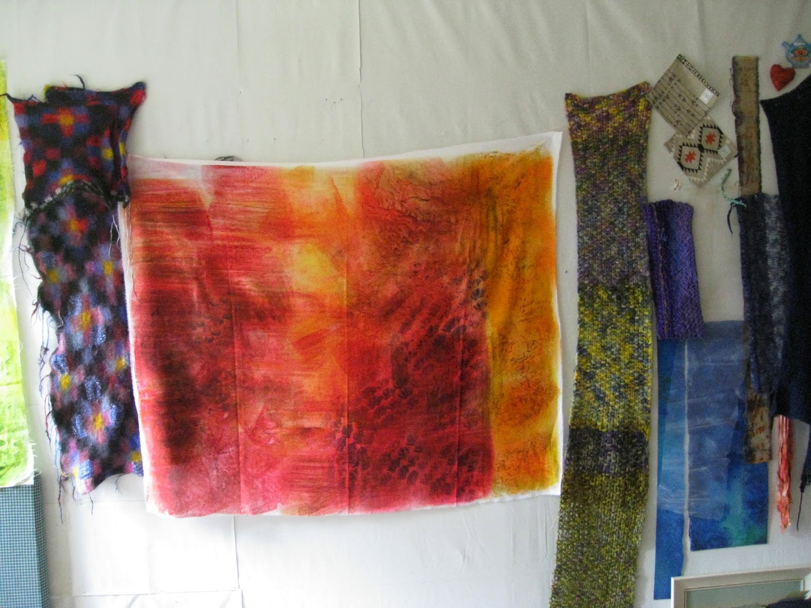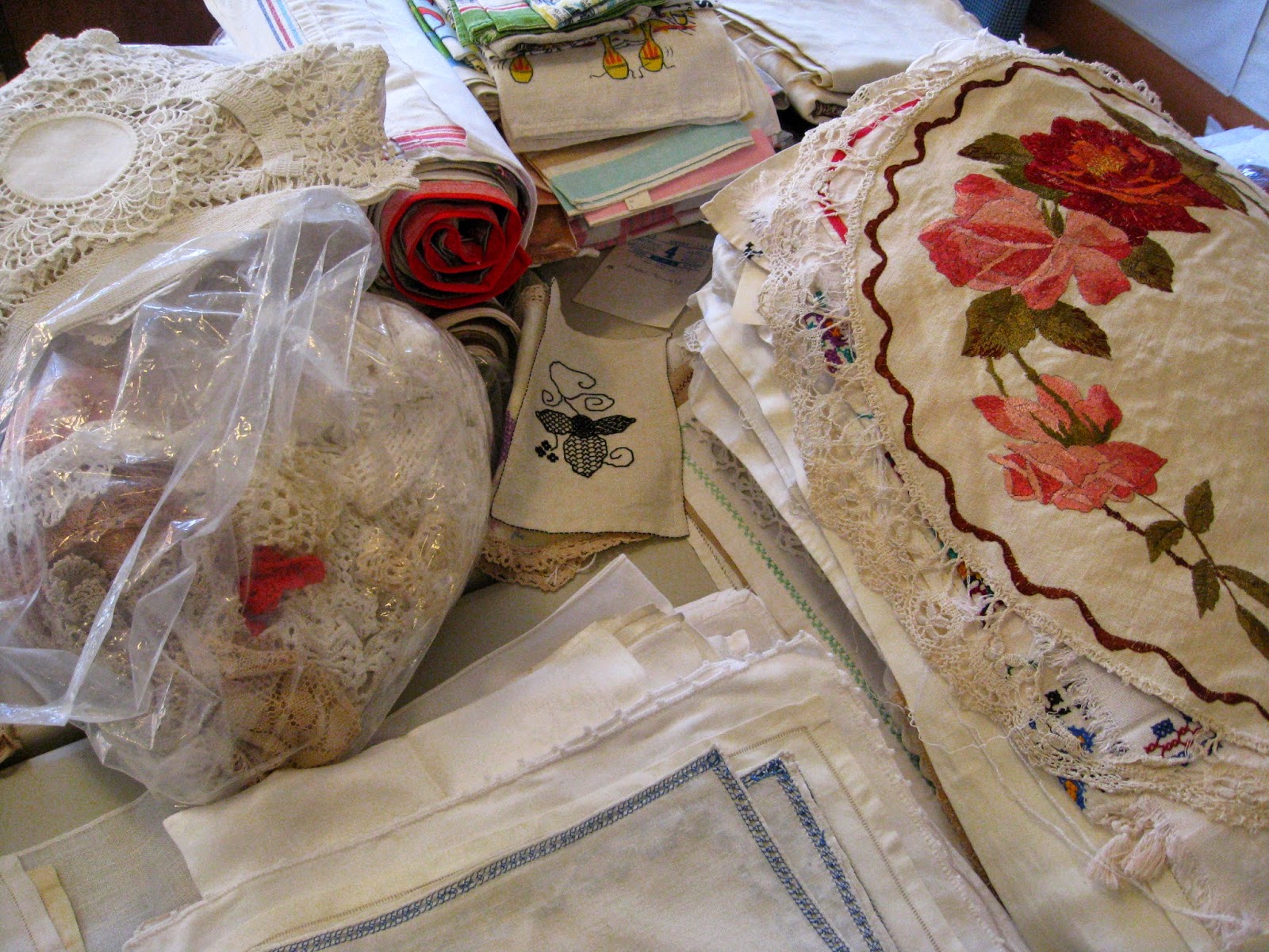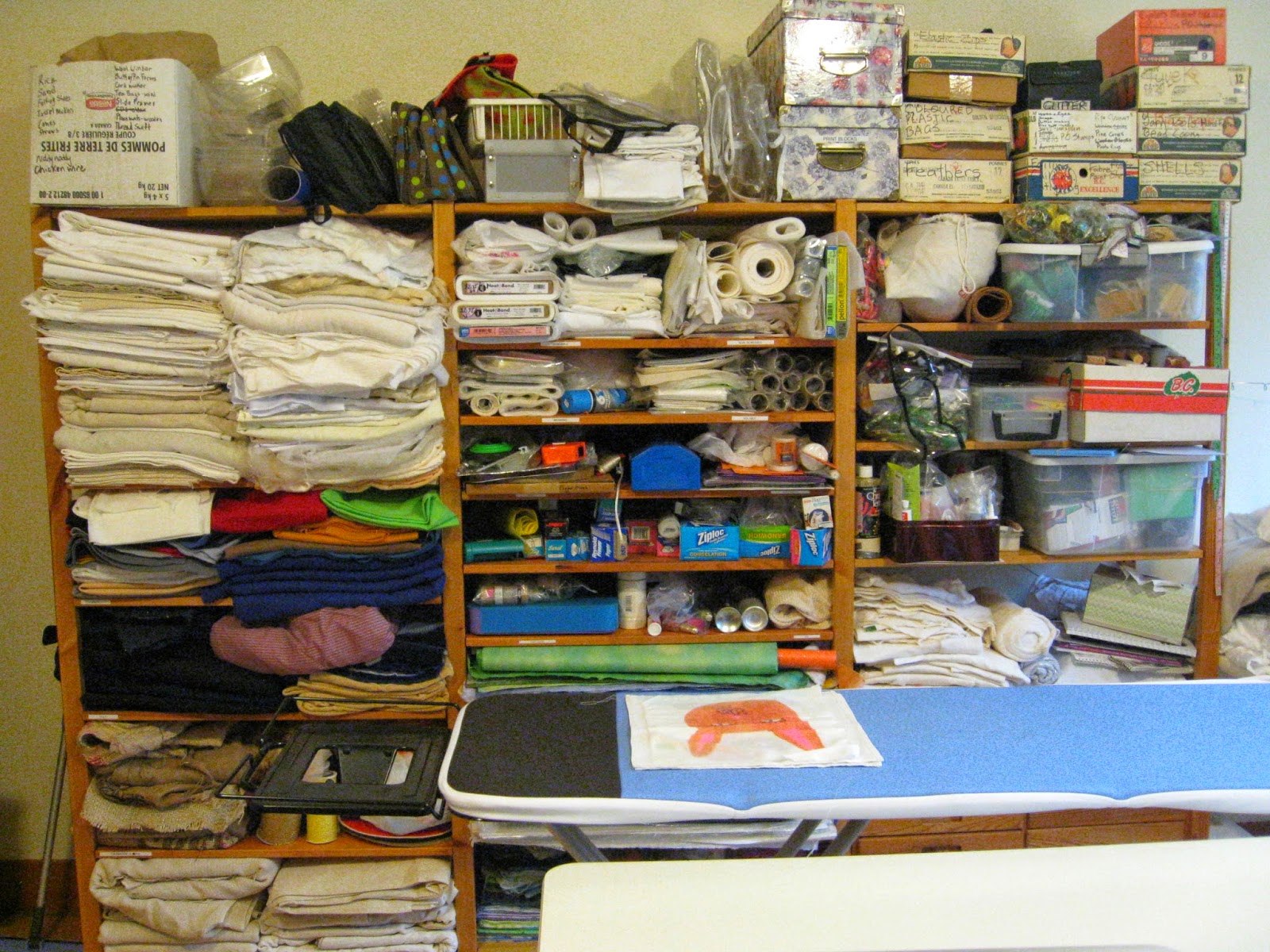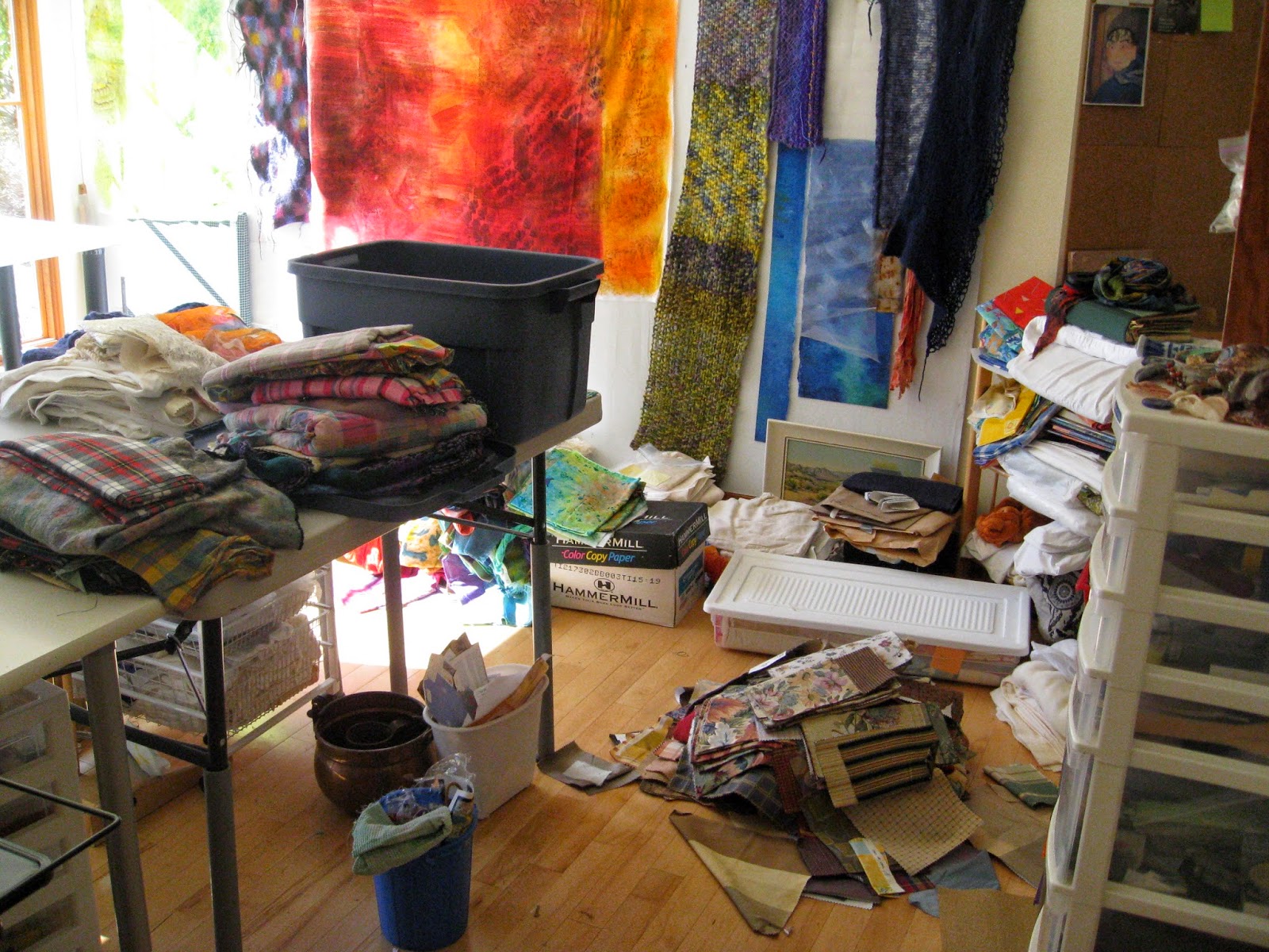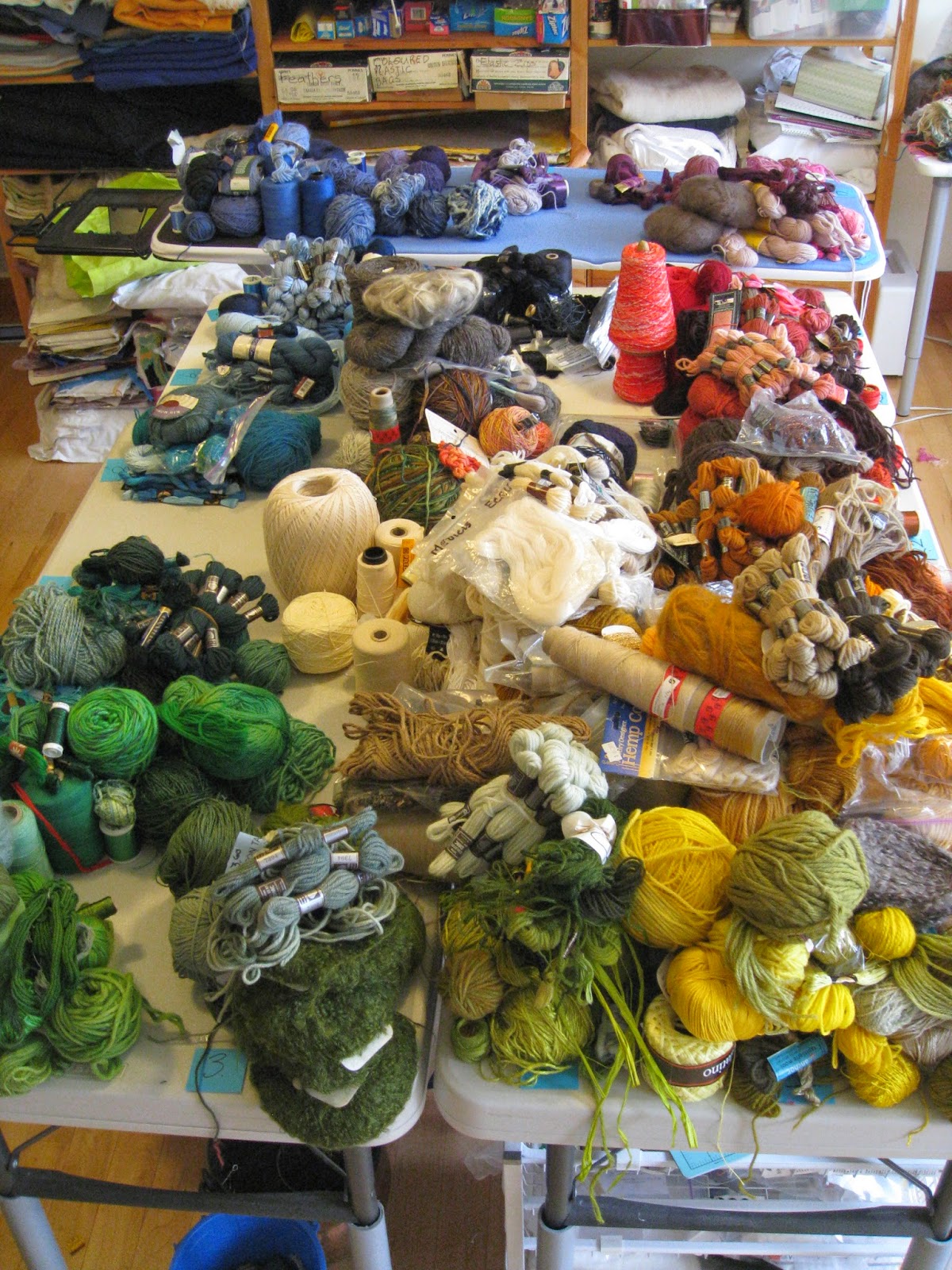 Sorting threads and yarns into 24 colour hues. Each pile gets put in its own bin.