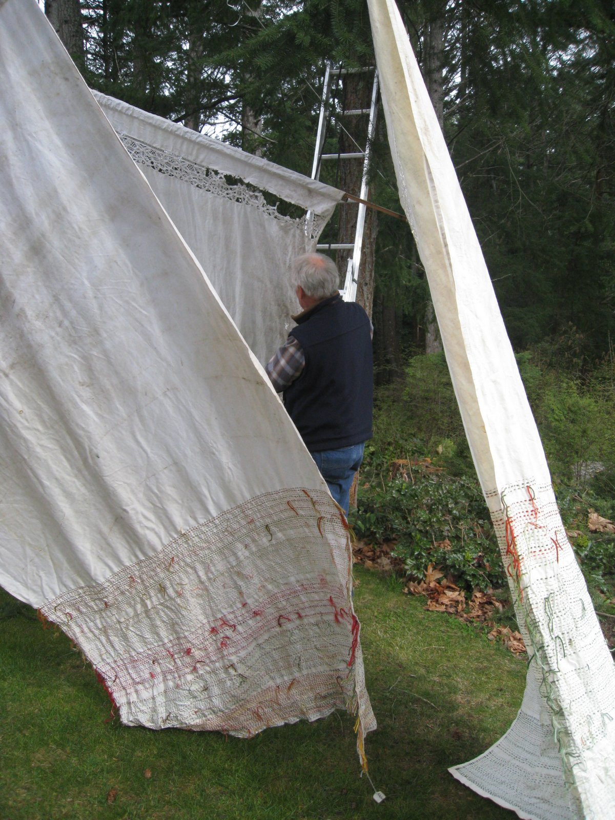 My lumber jack/sailor friend helped me with a trial installation of the 4 tree cloths.
