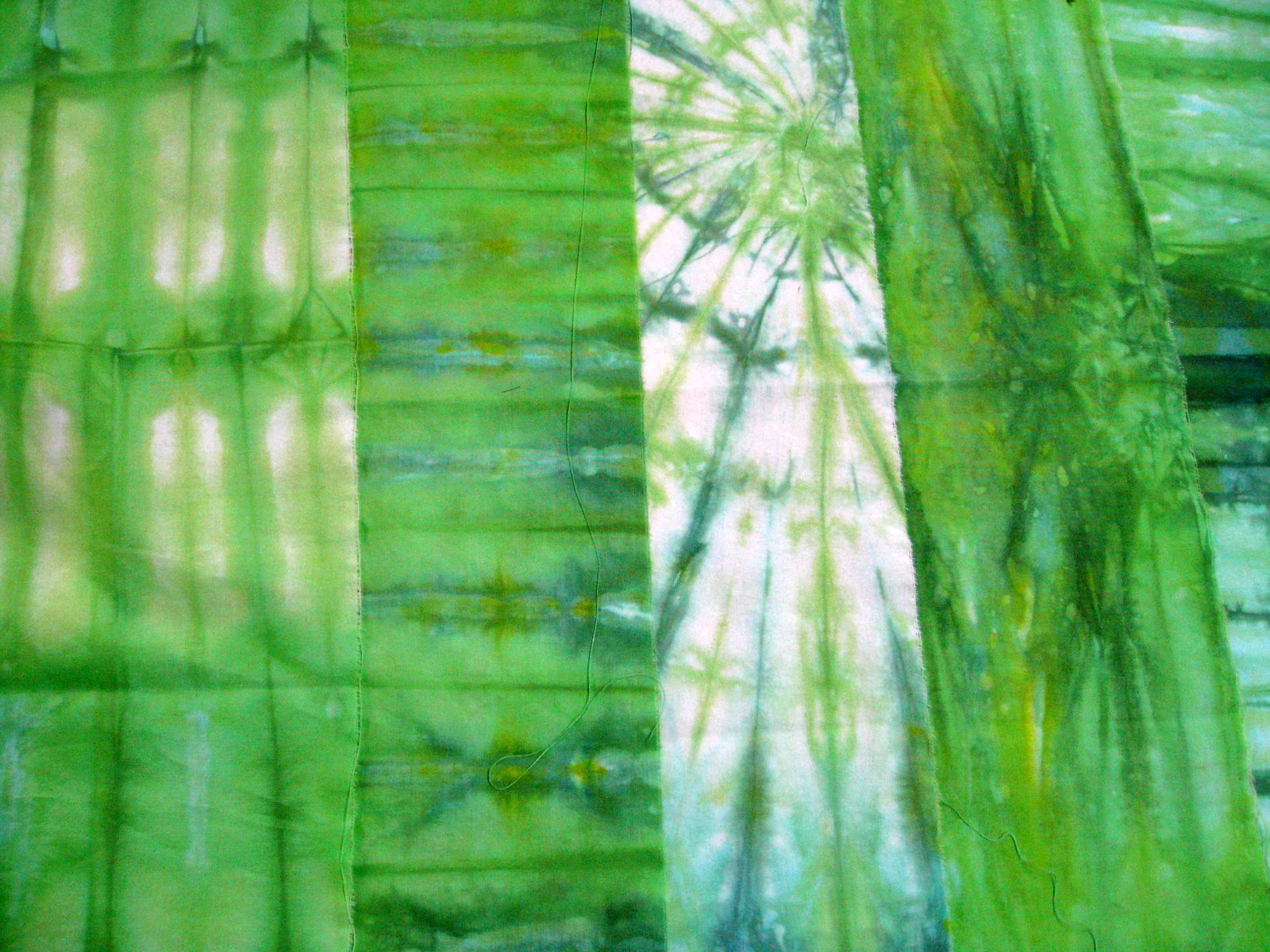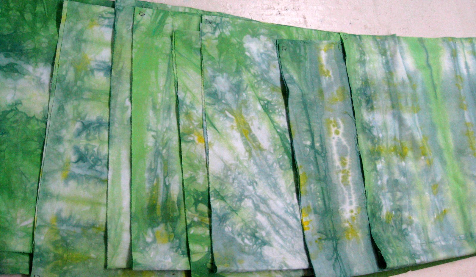 The cloths were folded 6 different ways to give distinctive marks.The same folds were repeated with the 2nd dyeing.This is Sarah's 1st layer of dye.