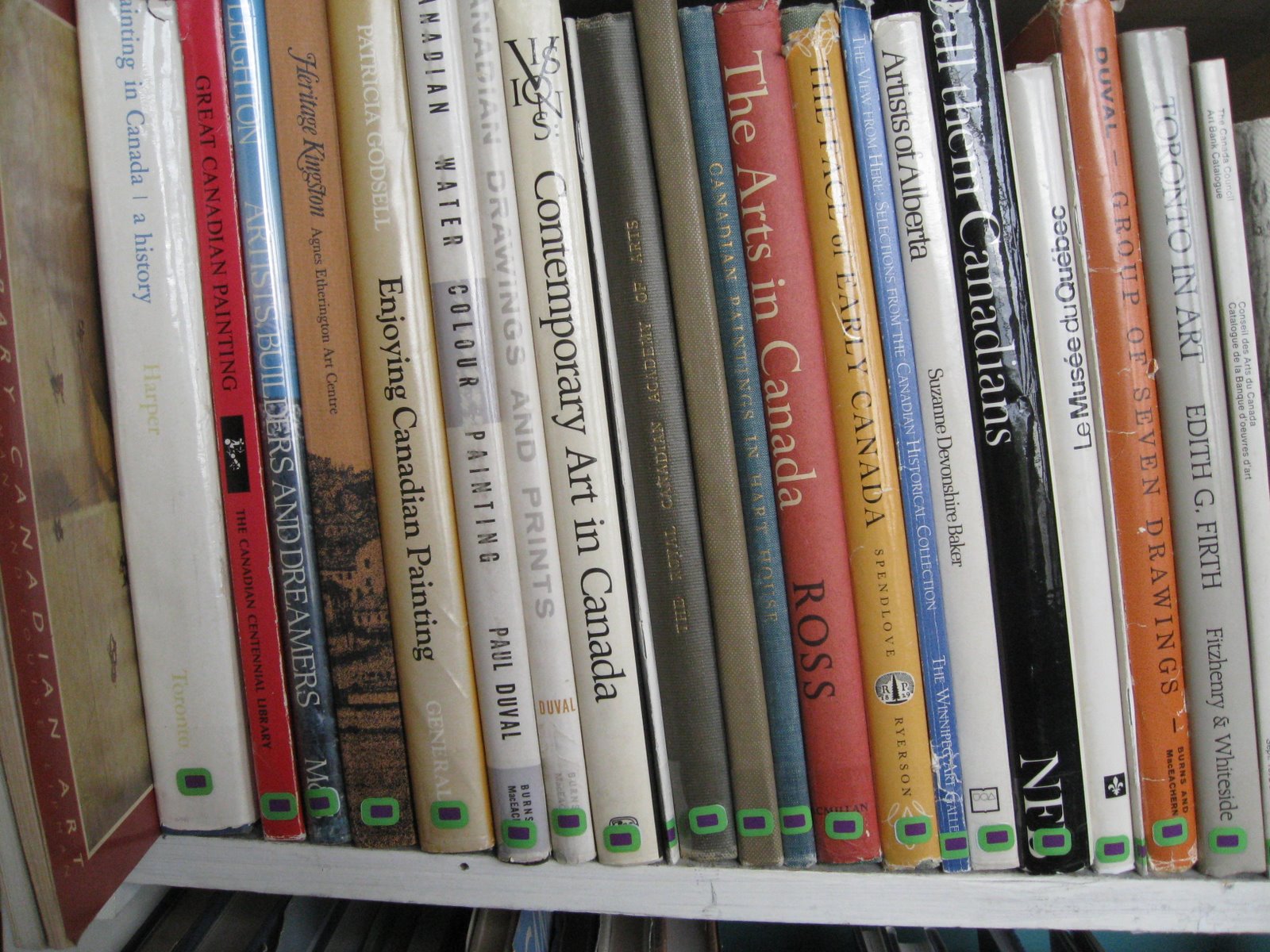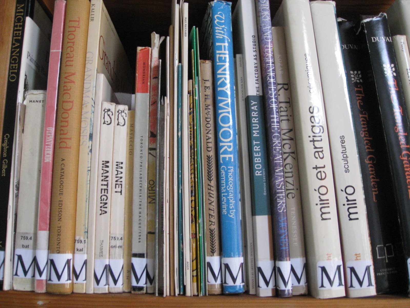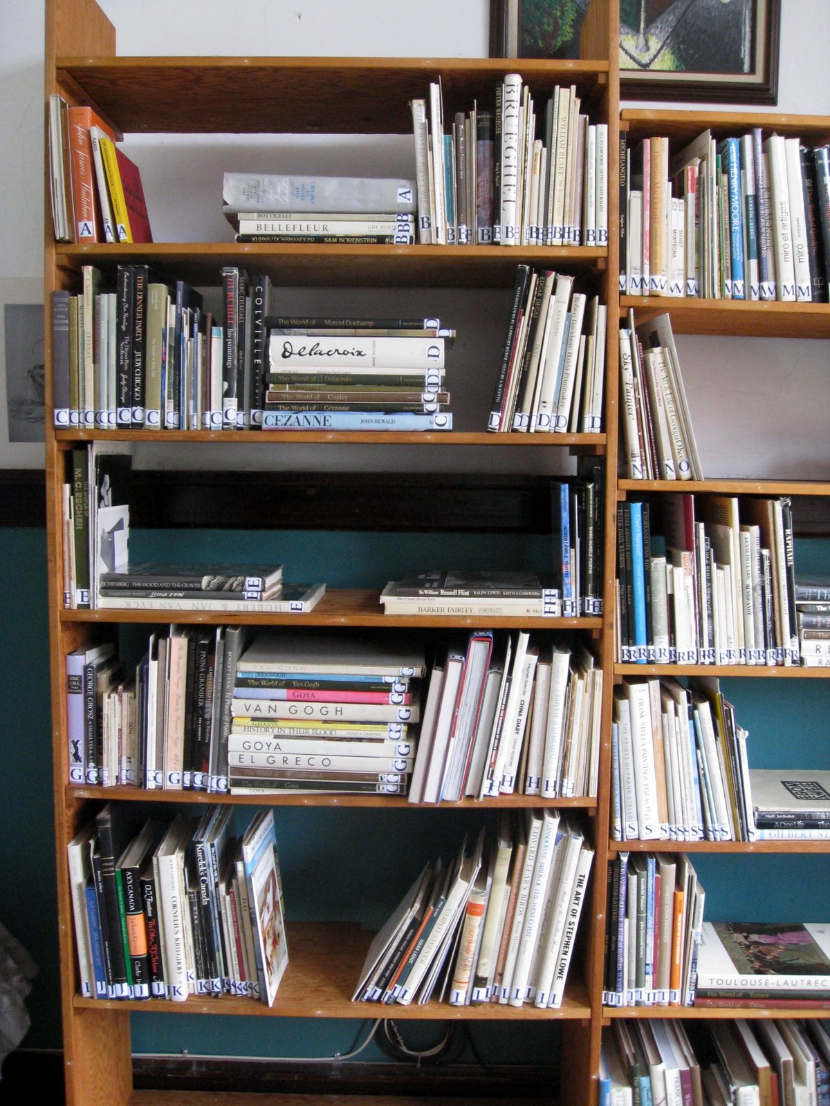 All of the books on individual artists are grouped and labelled with a bold sticker matching the first letter of the name of the artist.