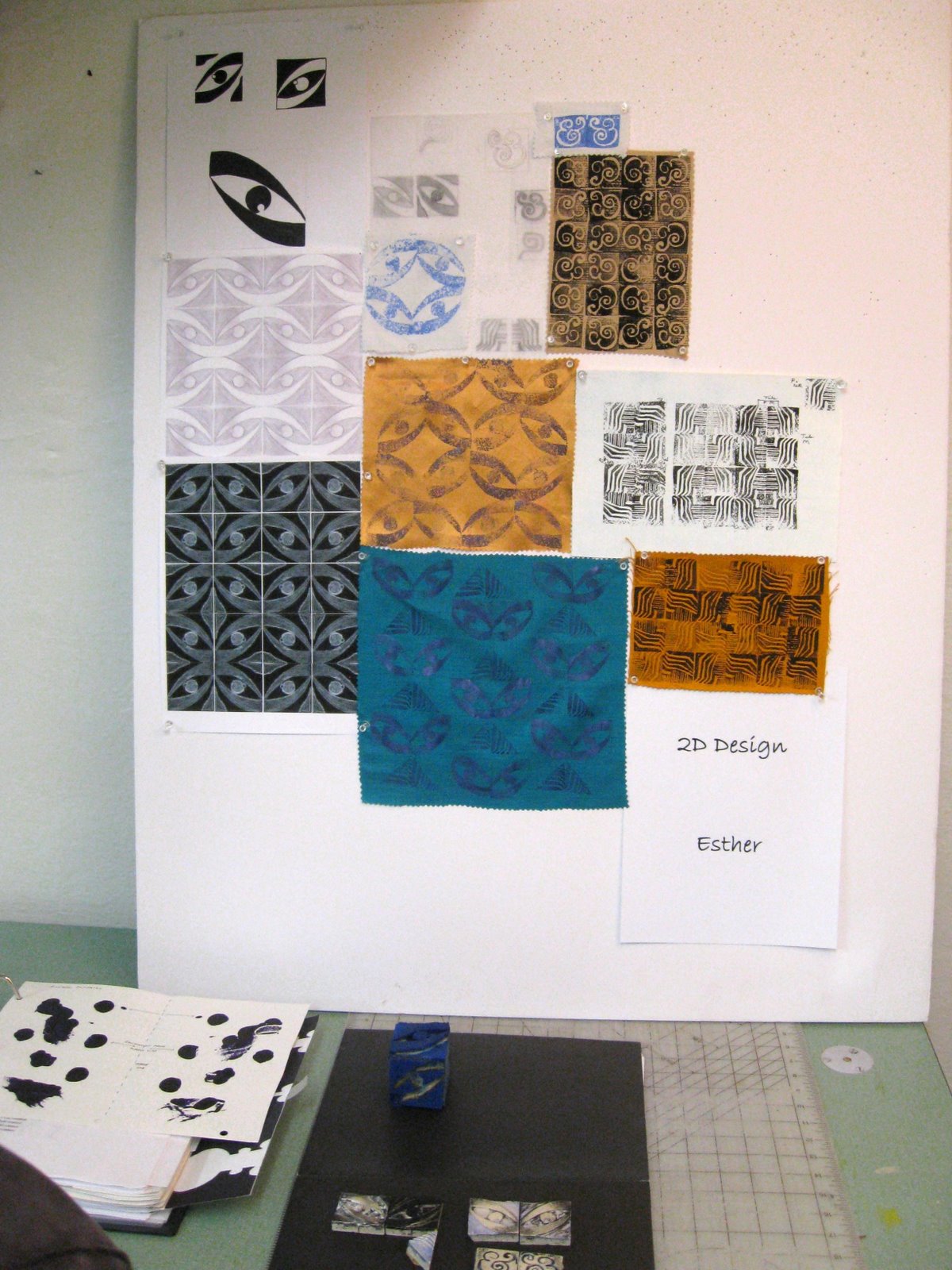 This is Esther Paterson's display of work she did in the Pattern Design for Artists course.Esther chose to work with an eye motif and produced many patterns she will use in her work.