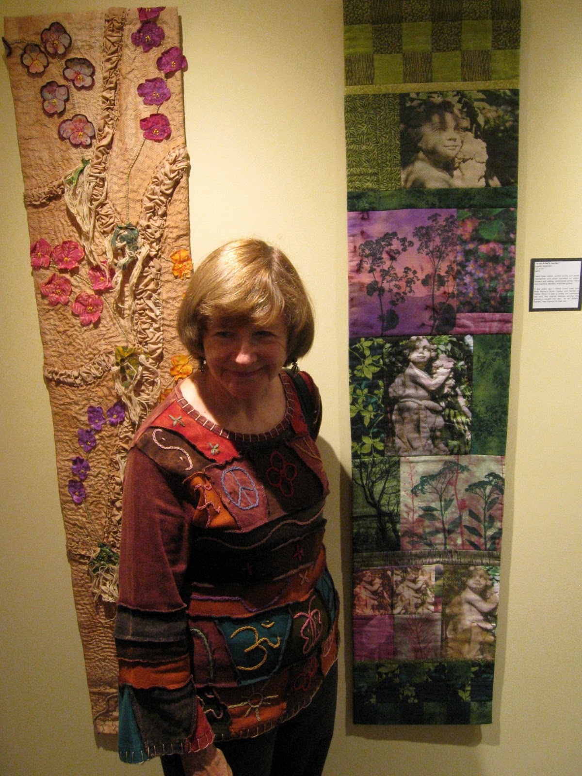 Photo transfer, procion dyed cloth, mono printing, screen printing, sun prints, machine & hand stitched.