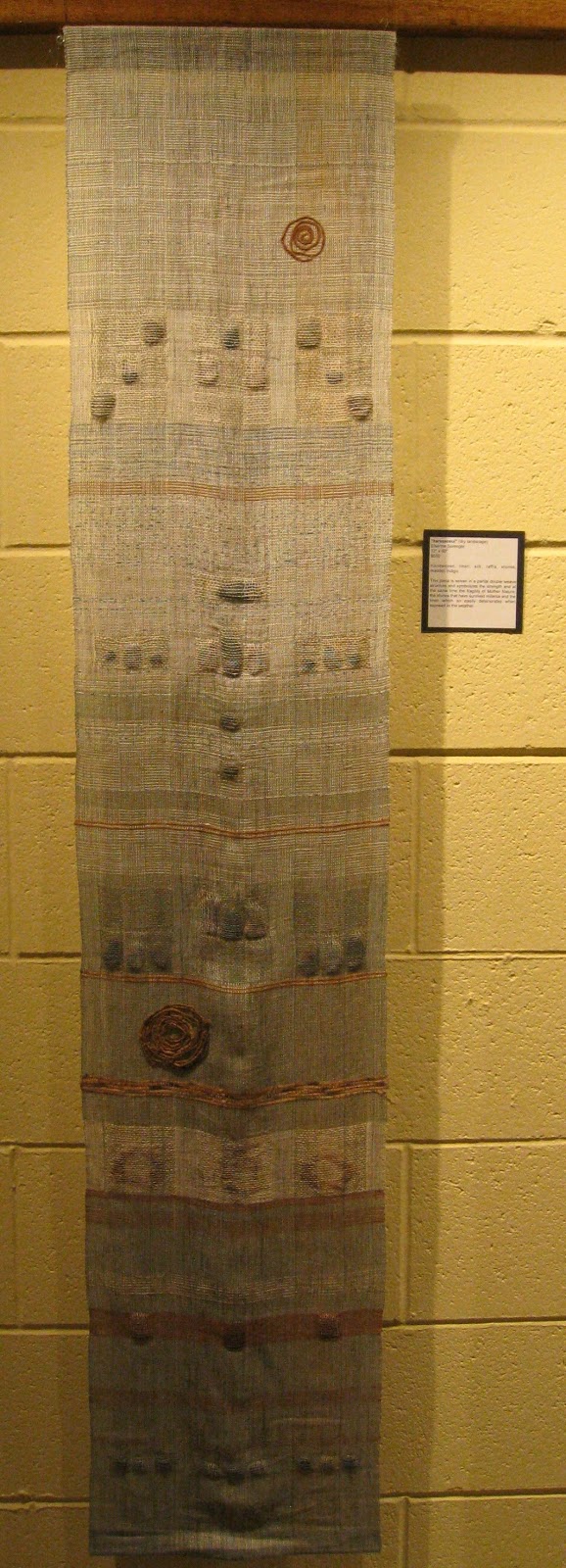 "This piece is woven in a partial double weave structure and symbolises the strength and at the same time the fragility of Mother Nature; the stones that have survived millennia and the linen which so easily deteriorates when exposed to the weather."