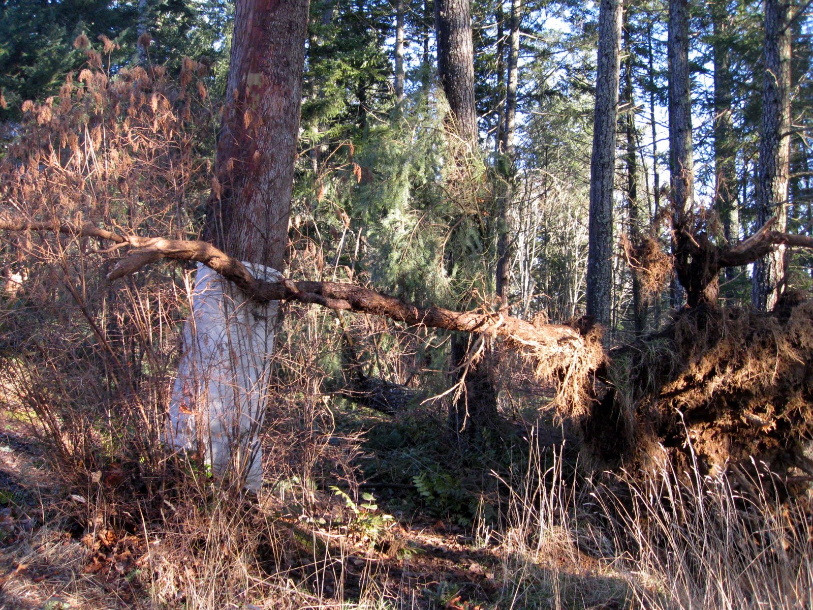 During another wind storm a tree was blown down. One of its roots flew up in the air and pinned the Arbutus cloth against the tree.