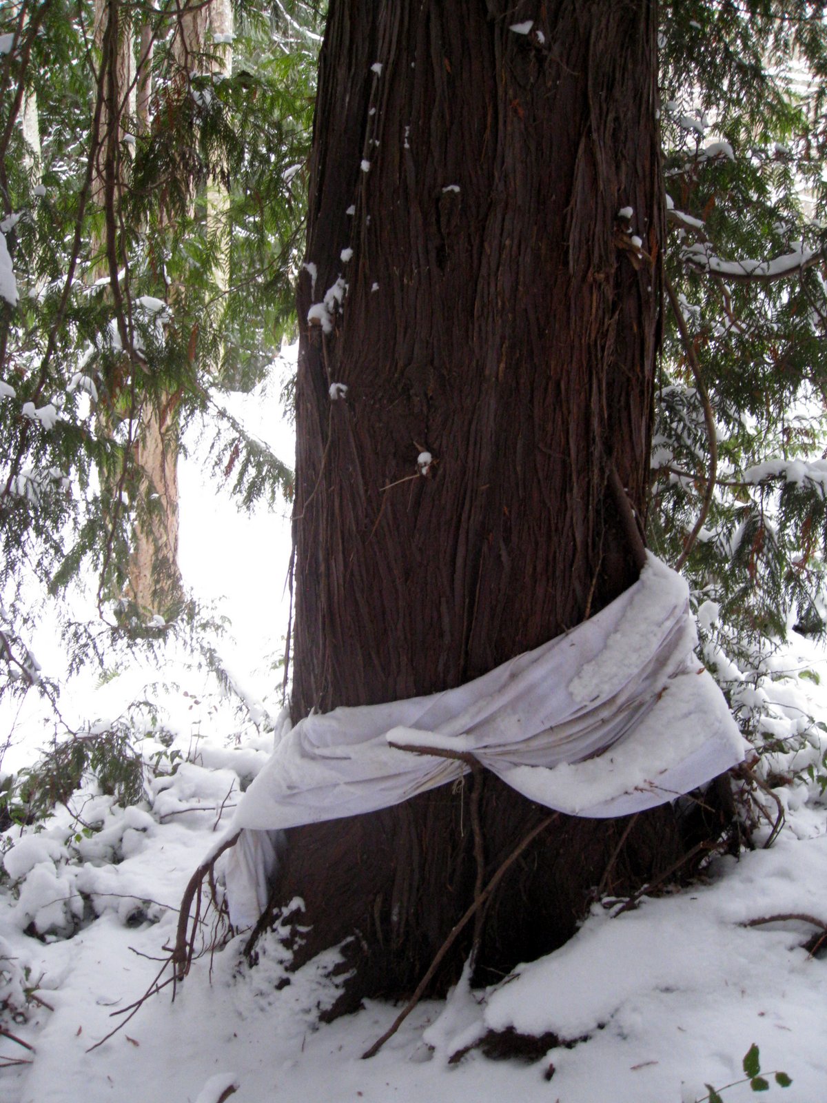 Over winter there were a number of challenges I had to respond to.A wet, heavy snow accumulation broke the string and the 2nd Cedar cloth fell down.The lace insert in the top of the Maple cloth was decaying and tore on a snag.During a wind storm my husband and I watched the Douglas-fir cloth flapping wildly. My husband is a sailor and said, 'Now there's a sail maker's friend.' During a lull in the wind I raced out and cut the cloth off the tree.Now 3 cloths were inside for their own survival.