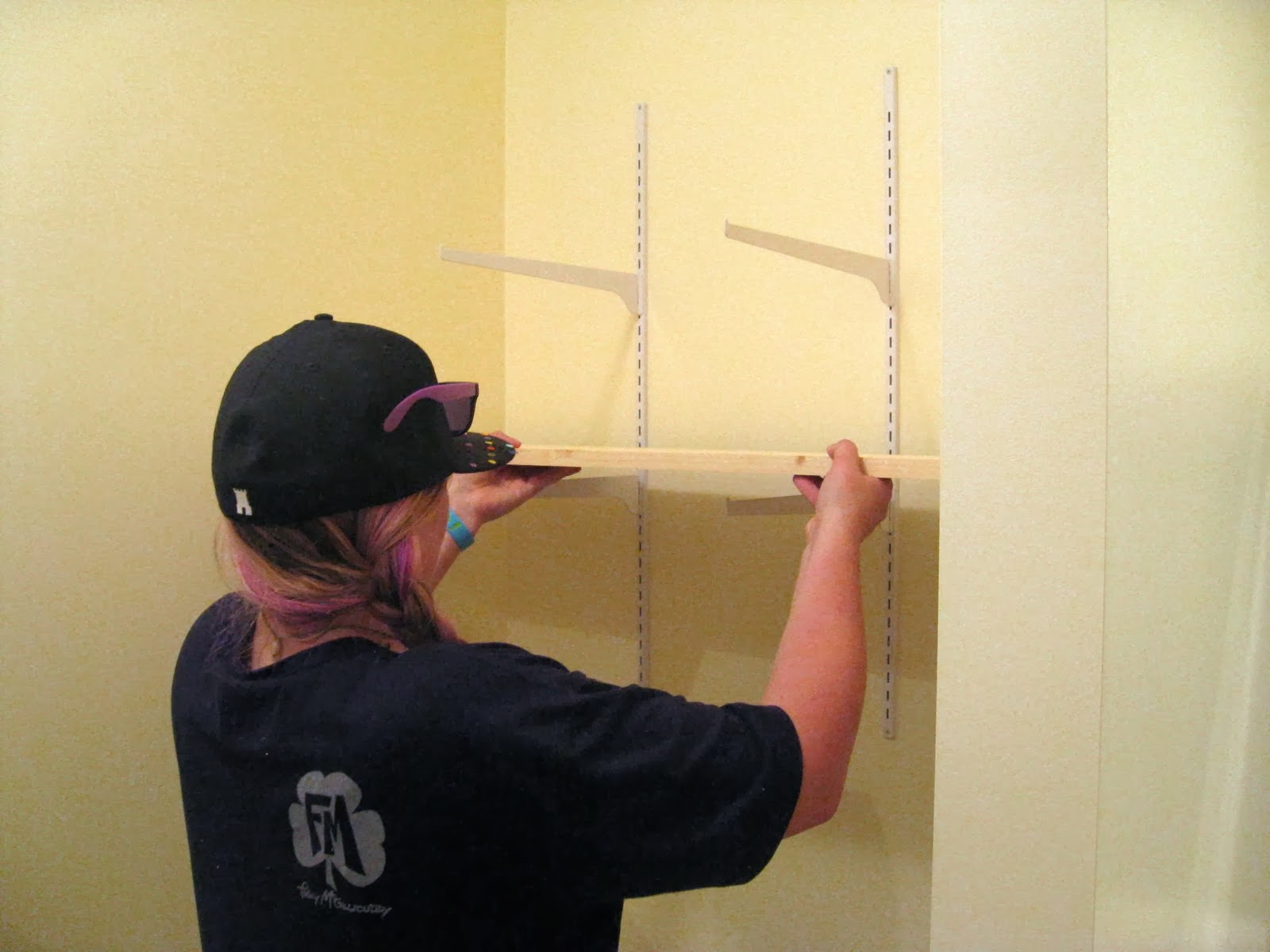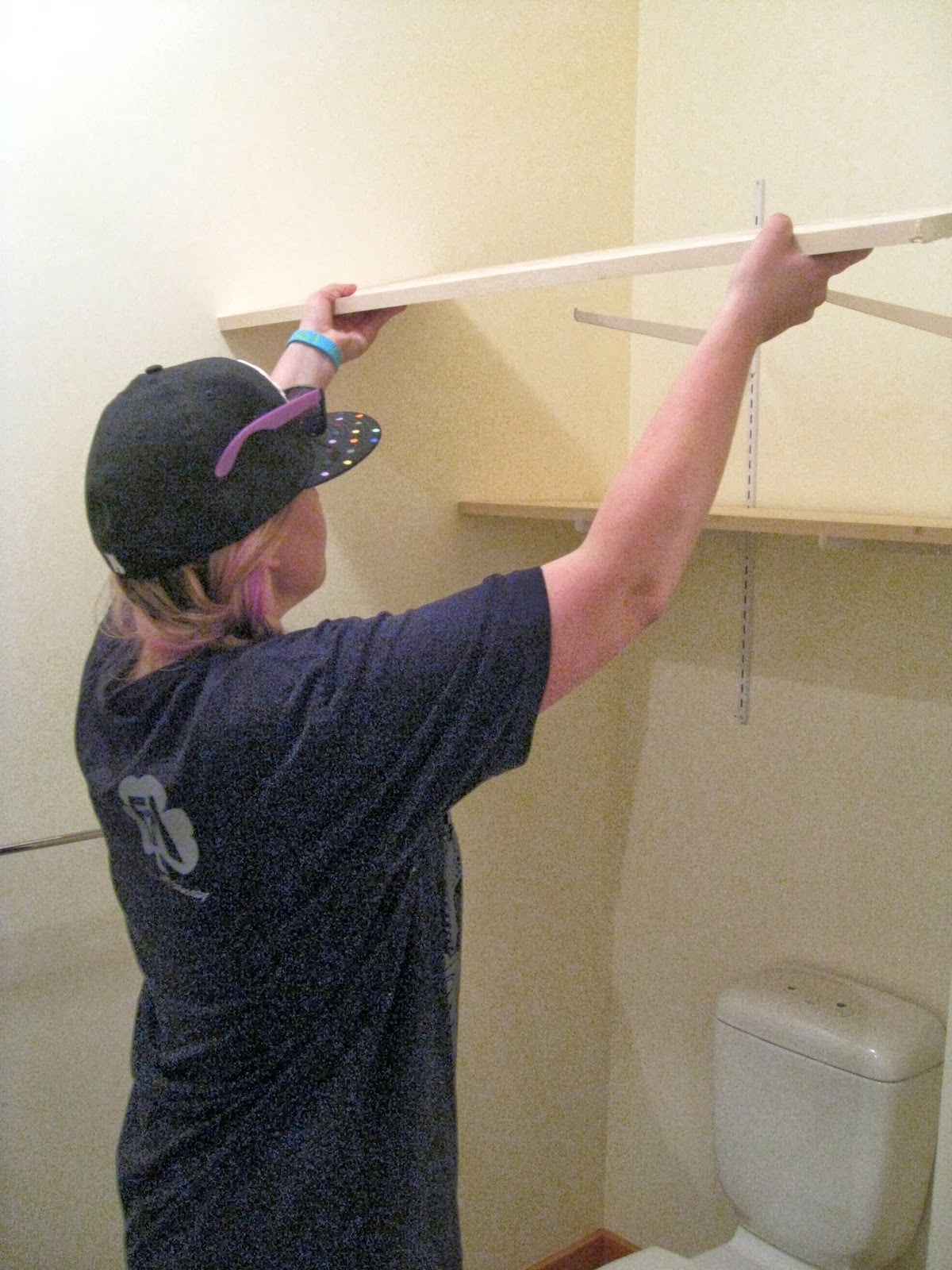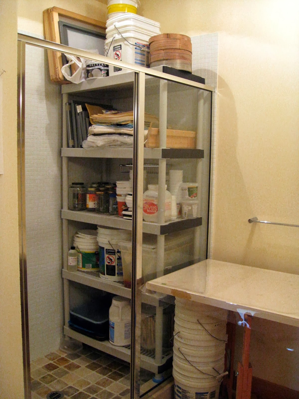 With the door taken off the shower it is easier to get into the rinsing area. A plastic shelving unit stores waterproof dyeing equipment close at hand.
