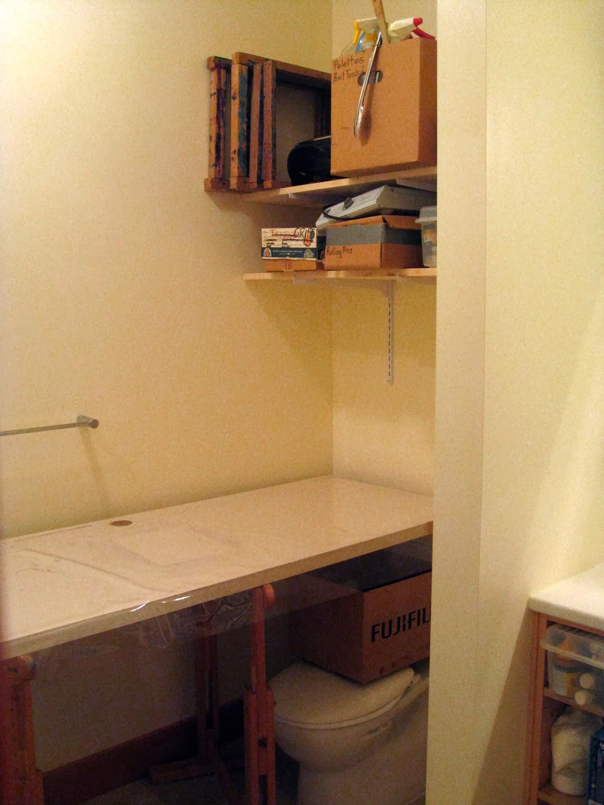 Two drawers of print tools.When is a bathroom not a bathroom?When it is a dye studio!