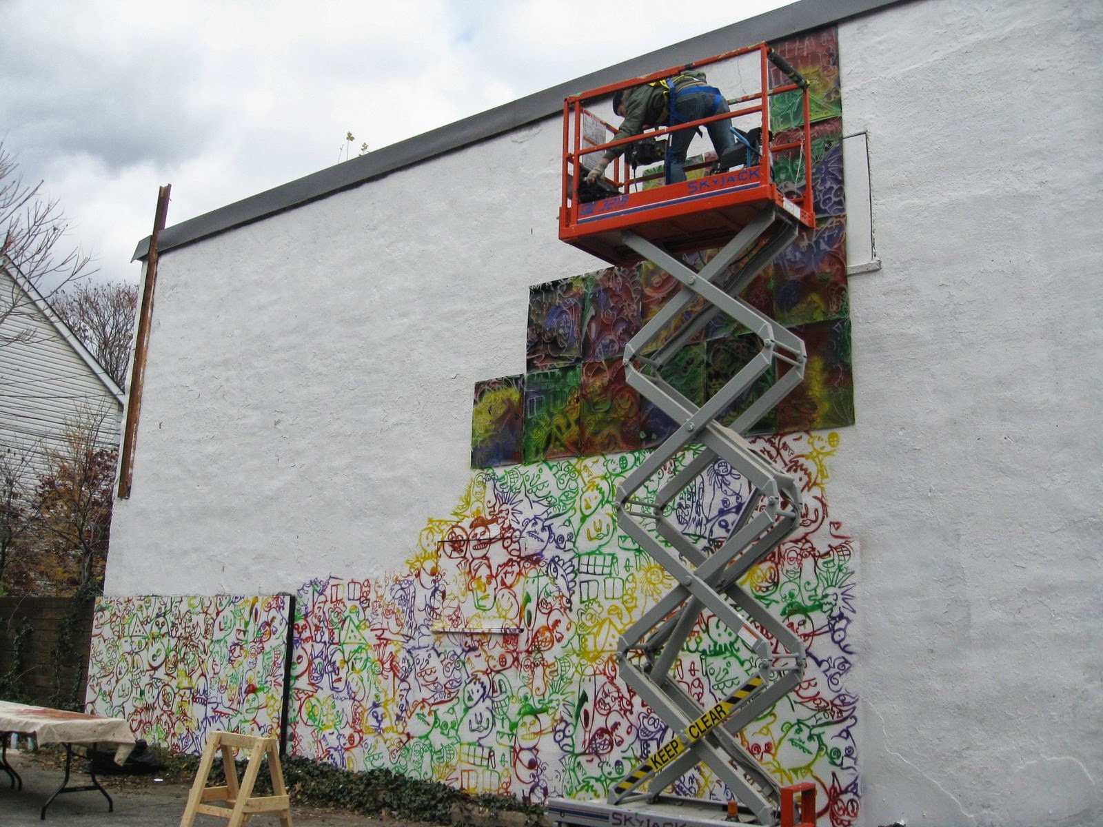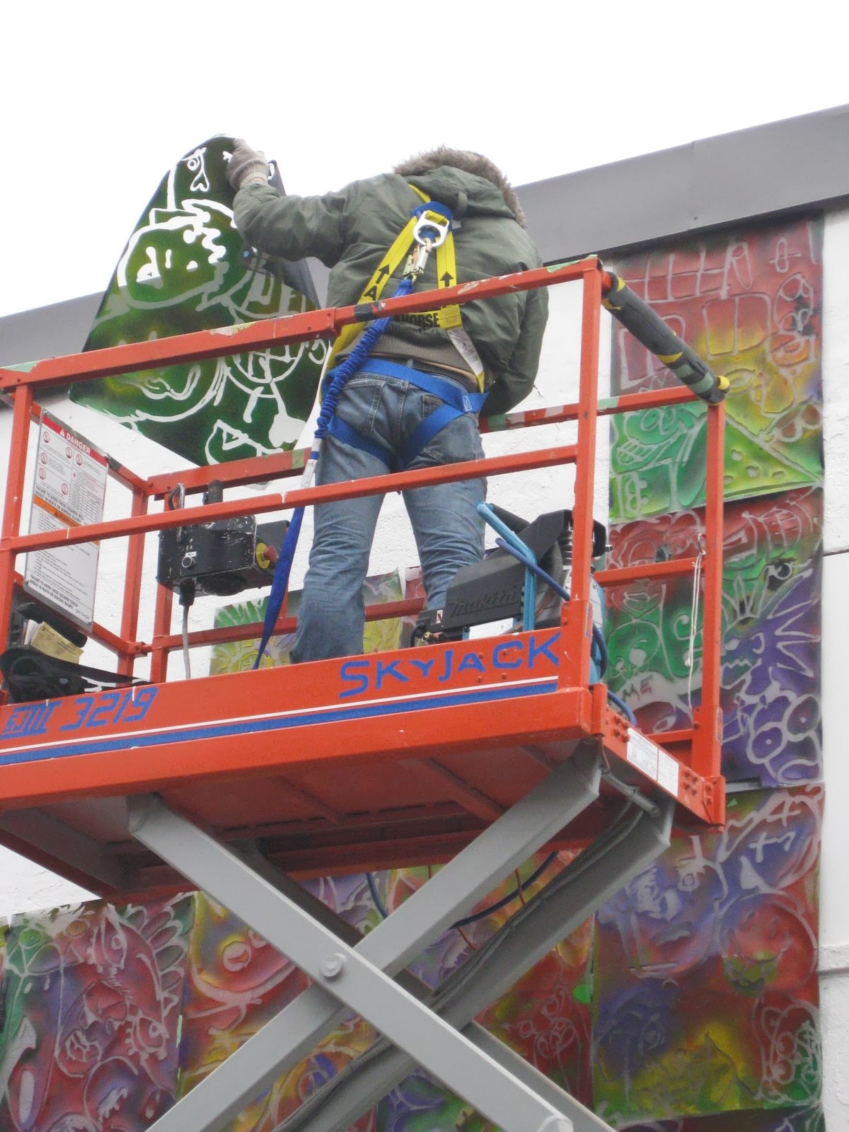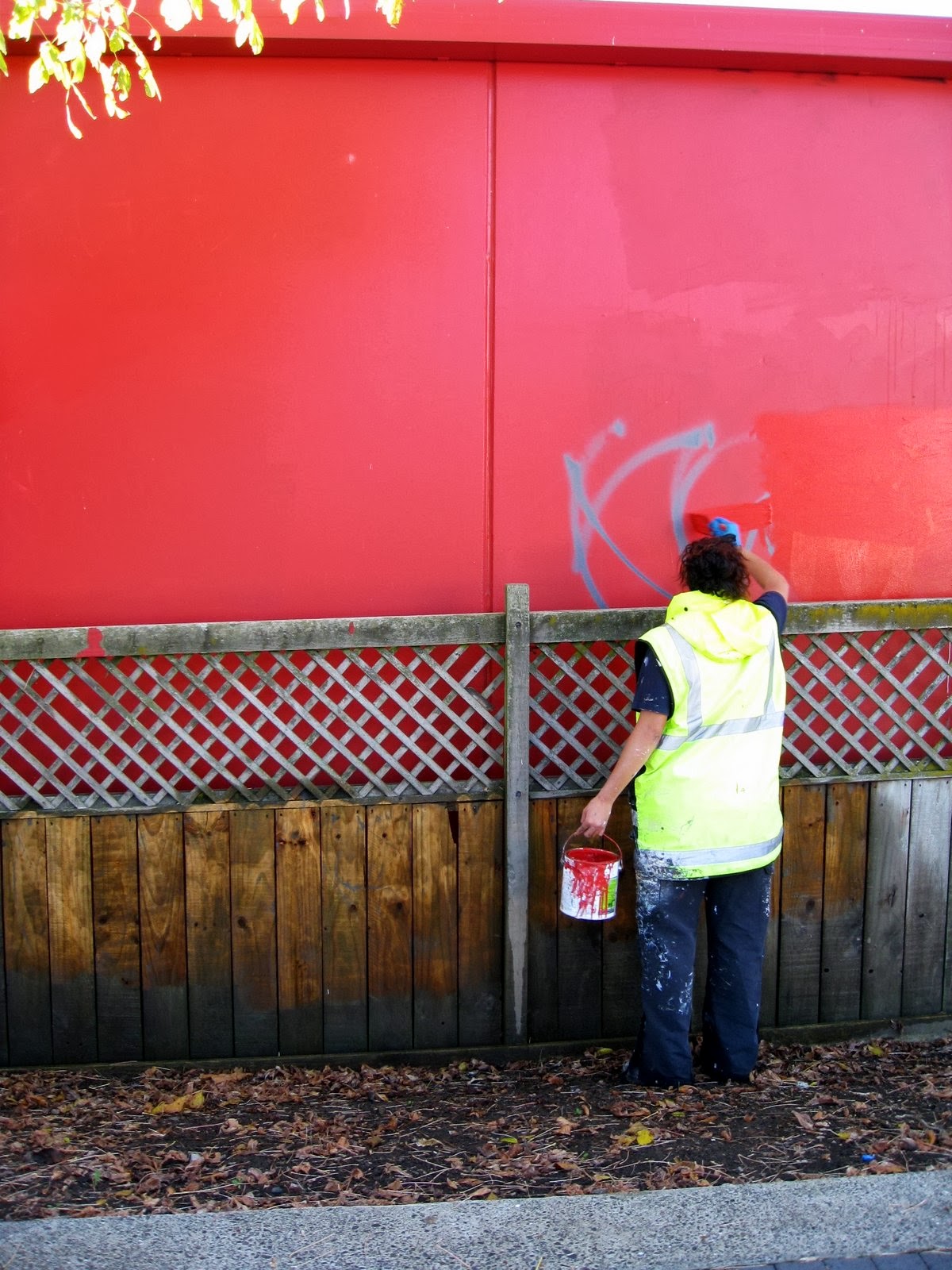 When I travel I like to photograph examples of graffiti.Here a person is marking a blank white wall with spray paint....